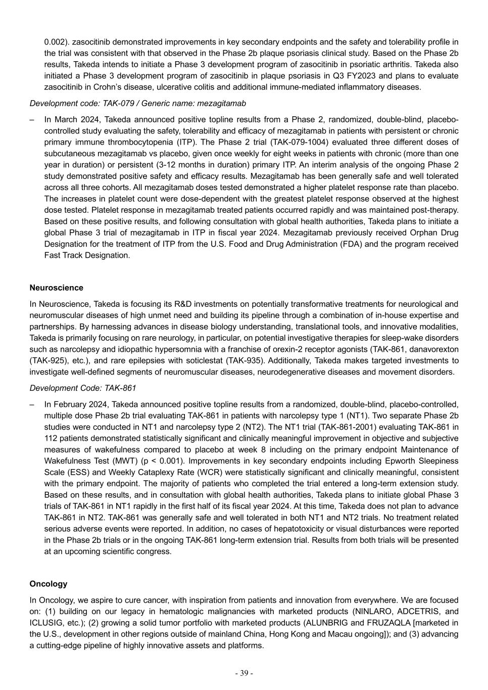 - 39 - 0.002). zasocitinib demonstrated improvements in key secondary endpoints and the safety and tolerability profile in the trial was consistent with that observed in the Phase 2b plaque psoriasis clinical study. Based on the Phase 2b results, Takeda intends to initiate a Phase 3 development program of zasocitinib in psoriatic arthritis. Takeda also initiated a Phase 3 development program of zasocitinib in plaque psoriasis in Q3 FY2023 and plans to evaluate zasocitinib in Crohn’s disease, ulcerative colitis and additional immune-mediated inflammatory diseases. Development code: TAK-079 / Generic name: mezagitamab – In March 2024, Takeda announced positive topline results from a Phase 2, randomized, double-blind, placebo- controlled study evaluating the safety, tolerability and efficacy of mezagitamab in patients with persistent or chronic primary immune thrombocytopenia (ITP). The Phase 2 trial (TAK-079-1004) evaluated three different doses of subcutaneous mezagitamab vs placebo, given once weekly for eight weeks in patients with chronic (more than one year in duration) or persistent (3-12 months in duration) primary ITP. An interim analysis of the ongoing Phase 2 study demonstrated positive safety and efficacy results. Mezagitamab has been generally safe and well tolerated across all three cohorts. All mezagitamab doses tested demonstrated a higher platelet response rate than placebo. The increases in platelet count were dose-dependent with the greatest platelet response observed at the highest dose tested. Platelet response in mezagitamab treated patients occurred rapidly and was maintained post-therapy. Based on these positive results, and following consultation with global health authorities, Takeda plans to initiate a global Phase 3 trial of mezagitamab in ITP in fiscal year 2024. Mezagitamab previously received Orphan Drug Designation for the treatment of ITP from the U.S. Food and Drug Administration (FDA) and the program received Fast Track Designation. Neuroscience In Neuroscience, Takeda is focusing its R&D investments on potentially transformative treatments for neurological and neuromuscular diseases of high unmet need and building its pipeline through a combination of in-house expertise and partnerships. By harnessing advances in disease biology understanding, translational tools, and innovative modalities, Takeda is primarily focusing on rare neurology, in particular, on potential investigative therapies for sleep-wake disorders such as narcolepsy and idiopathic hypersomnia with a franchise of orexin-2 receptor agonists (TAK-861, danavorexton (TAK-925), etc.), and rare epilepsies with soticlestat (TAK-935). Additionally, Takeda makes targeted investments to investigate well-defined segments of neuromuscular diseases, neurodegenerative diseases and movement disorders. Development Code: TAK-861 – In February 2024, Takeda announced positive topline results from a randomized, double-blind, placebo-controlled, multiple dose Phase 2b trial evaluating TAK-861 in patients with narcolepsy type 1 (NT1). Two separate Phase 2b studies were conducted in NT1 and narcolepsy type 2 (NT2). The NT1 trial (TAK-861-2001) evaluating TAK-861 in 112 patients demonstrated statistically significant and clinically meaningful improvement in objective and subjective measures of wakefulness compared to placebo at week 8 including on the primary endpoint Maintenance of Wakefulness Test (MWT) (p < 0.001). Improvements in key secondary endpoints including Epworth Sleepiness Scale (ESS) and Weekly Cataplexy Rate (WCR) were statistically significant and clinically meaningful, consistent with the primary endpoint. The majority of patients who completed the trial entered a long-term extension study. Based on these results, and in consultation with global health authorities, Takeda plans to initiate global Phase 3 trials of TAK-861 in NT1 rapidly in the first half of its fiscal year 2024. At this time, Takeda does not plan to advance TAK-861 in NT2. TAK-861 was generally safe and well tolerated in both NT1 and NT2 trials. No treatment related serious adverse events were reported. In addition, no cases of hepatotoxicity or visual disturbances were reported in the Phase 2b trials or in the ongoing TAK-861 long-term extension trial. Results from both trials will be presented at an upcoming scientific congress. Oncology In Oncology, we aspire to cure cancer, with inspiration from patients and innovation from everywhere. We are focused on: (1) building on our legacy in hematologic malignancies with marketed products (NINLARO, ADCETRIS, and ICLUSIG, etc.); (2) growing a solid tumor portfolio with marketed products (ALUNBRIG and FRUZAQLA [marketed in the U.S., development in other regions outside of mainland China, Hong Kong and Macau ongoing]); and (3) advancing a cutting-edge pipeline of highly innovative assets and platforms.