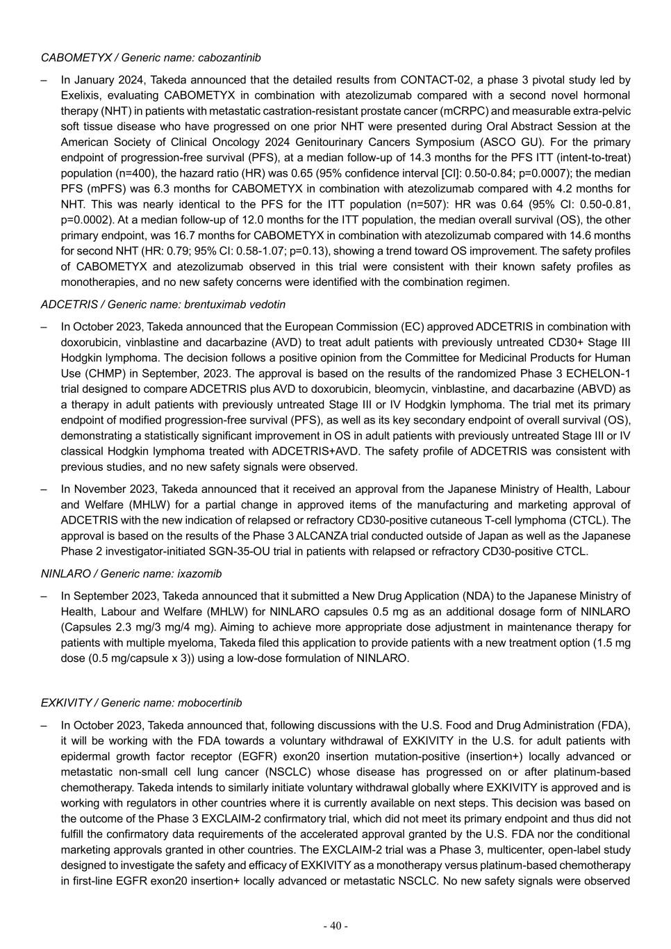 - 40 - CABOMETYX / Generic name: cabozantinib – In January 2024, Takeda announced that the detailed results from CONTACT-02, a phase 3 pivotal study led by Exelixis, evaluating CABOMETYX in combination with atezolizumab compared with a second novel hormonal therapy (NHT) in patients with metastatic castration-resistant prostate cancer (mCRPC) and measurable extra-pelvic soft tissue disease who have progressed on one prior NHT were presented during Oral Abstract Session at the American Society of Clinical Oncology 2024 Genitourinary Cancers Symposium (ASCO GU). For the primary endpoint of progression-free survival (PFS), at a median follow-up of 14.3 months for the PFS ITT (intent-to-treat) population (n=400), the hazard ratio (HR) was 0.65 (95% confidence interval [CI]: 0.50-0.84; p=0.0007); the median PFS (mPFS) was 6.3 months for CABOMETYX in combination with atezolizumab compared with 4.2 months for NHT. This was nearly identical to the PFS for the ITT population (n=507): HR was 0.64 (95% CI: 0.50-0.81, p=0.0002). At a median follow-up of 12.0 months for the ITT population, the median overall survival (OS), the other primary endpoint, was 16.7 months for CABOMETYX in combination with atezolizumab compared with 14.6 months for second NHT (HR: 0.79; 95% CI: 0.58-1.07; p=0.13), showing a trend toward OS improvement. The safety profiles of CABOMETYX and atezolizumab observed in this trial were consistent with their known safety profiles as monotherapies, and no new safety concerns were identified with the combination regimen. ADCETRIS / Generic name: brentuximab vedotin – In October 2023, Takeda announced that the European Commission (EC) approved ADCETRIS in combination with doxorubicin, vinblastine and dacarbazine (AVD) to treat adult patients with previously untreated CD30+ Stage III Hodgkin lymphoma. The decision follows a positive opinion from the Committee for Medicinal Products for Human Use (CHMP) in September, 2023. The approval is based on the results of the randomized Phase 3 ECHELON-1 trial designed to compare ADCETRIS plus AVD to doxorubicin, bleomycin, vinblastine, and dacarbazine (ABVD) as a therapy in adult patients with previously untreated Stage III or IV Hodgkin lymphoma. The trial met its primary endpoint of modified progression-free survival (PFS), as well as its key secondary endpoint of overall survival (OS), demonstrating a statistically significant improvement in OS in adult patients with previously untreated Stage III or IV classical Hodgkin lymphoma treated with ADCETRIS+AVD. The safety profile of ADCETRIS was consistent with previous studies, and no new safety signals were observed. – In November 2023, Takeda announced that it received an approval from the Japanese Ministry of Health, Labour and Welfare (MHLW) for a partial change in approved items of the manufacturing and marketing approval of ADCETRIS with the new indication of relapsed or refractory CD30-positive cutaneous T-cell lymphoma (CTCL). The approval is based on the results of the Phase 3 ALCANZA trial conducted outside of Japan as well as the Japanese Phase 2 investigator-initiated SGN-35-OU trial in patients with relapsed or refractory CD30-positive CTCL. NINLARO / Generic name: ixazomib – In September 2023, Takeda announced that it submitted a New Drug Application (NDA) to the Japanese Ministry of Health, Labour and Welfare (MHLW) for NINLARO capsules 0.5 mg as an additional dosage form of NINLARO (Capsules 2.3 mg/3 mg/4 mg). Aiming to achieve more appropriate dose adjustment in maintenance therapy for patients with multiple myeloma, Takeda filed this application to provide patients with a new treatment option (1.5 mg dose (0.5 mg/capsule x 3)) using a low-dose formulation of NINLARO. EXKIVITY / Generic name: mobocertinib – In October 2023, Takeda announced that, following discussions with the U.S. Food and Drug Administration (FDA), it will be working with the FDA towards a voluntary withdrawal of EXKIVITY in the U.S. for adult patients with epidermal growth factor receptor (EGFR) exon20 insertion mutation-positive (insertion+) locally advanced or metastatic non-small cell lung cancer (NSCLC) whose disease has progressed on or after platinum-based chemotherapy. Takeda intends to similarly initiate voluntary withdrawal globally where EXKIVITY is approved and is working with regulators in other countries where it is currently available on next steps. This decision was based on the outcome of the Phase 3 EXCLAIM-2 confirmatory trial, which did not meet its primary endpoint and thus did not fulfill the confirmatory data requirements of the accelerated approval granted by the U.S. FDA nor the conditional marketing approvals granted in other countries. The EXCLAIM-2 trial was a Phase 3, multicenter, open-label study designed to investigate the safety and efficacy of EXKIVITY as a monotherapy versus platinum-based chemotherapy in first-line EGFR exon20 insertion+ locally advanced or metastatic NSCLC. No new safety signals were observed