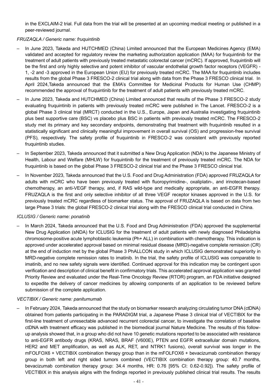 - 41 - in the EXCLAIM-2 trial. Full data from the trial will be presented at an upcoming medical meeting or published in a peer-reviewed journal. FRUZAQLA / Generic name: fruquintinib – In June 2023, Takeda and HUTCHMED (China) Limited announced that the European Medicines Agency (EMA) validated and accepted for regulatory review the marketing authorization application (MAA) for fruquintinib for the treatment of adult patients with previously treated metastatic colorectal cancer (mCRC). If approved, fruquintinib will be the first and only highly selective and potent inhibitor of vascular endothelial growth factor receptors (VEGFR) - 1, -2 and -3 approved in the European Union (EU) for previously treated mCRC. The MAA for fruquintinib includes results from the global Phase 3 FRESCO-2 clinical trial along with data from the Phase 3 FRESCO clinical trial. In April 2024,Takeda announced that the EMA’s Committee for Medicinal Products for Human Use (CHMP) recommended the approval of fruquintinib for the treatment of adult patients with previously treated mCRC. – In June 2023, Takeda and HUTCHMED (China) Limited announced that results of the Phase 3 FRESCO-2 study evaluating fruquintinib in patients with previously treated mCRC were published in The Lancet. FRESCO-2 is a global Phase 3 clinical trial (MRCT) conducted in the U.S., Europe, Japan and Australia investigating fruquintinib plus best supportive care (BSC) vs placebo plus BSC in patients with previously treated mCRC. The FRESCO-2 study met its primary and key secondary endpoints, demonstrating that treatment with fruquintinib resulted in a statistically significant and clinically meaningful improvement in overall survival (OS) and progression-free survival (PFS), respectively. The safety profile of fruquintinib in FRESCO-2 was consistent with previously reported fruquintinib studies. – In September 2023, Takeda announced that it submitted a New Drug Application (NDA) to the Japanese Ministry of Health, Labour and Welfare (MHLW) for fruquintinib for the treatment of previously treated mCRC. The NDA for fruquintinib is based on the global Phase 3 FRESCO-2 clinical trial and the Phase 3 FRESCO clinical trial. – In November 2023, Takeda announced that the U.S. Food and Drug Administration (FDA) approved FRUZAQLA for adults with mCRC who have been previously treated with fluoropyrimidine-, oxaliplatin-, and irinotecan-based chemotherapy, an anti-VEGF therapy, and, if RAS wild-type and medically appropriate, an anti-EGFR therapy. FRUZAQLA is the first and only selective inhibitor of all three VEGF receptor kinases approved in the U.S. for previously treated mCRC regardless of biomarker status. The approval of FRUZAQLA is based on data from two large Phase 3 trials: the global FRESCO-2 clinical trial along with the FRESCO clinical trial conducted in China. ICLUSIG / Generic name: ponatinib – In March 2024, Takeda announced that the U.S. Food and Drug Administration (FDA) approved the supplemental New Drug Application (sNDA) for ICLUSIG for the treatment of adult patients with newly diagnosed Philadelphia chromosome-positive acute lymphoblastic leukemia (Ph+ ALL) in combination with chemotherapy. This indication is approved under accelerated approval based on minimal residual disease (MRD)-negative complete remission (CR) at the end of induction met by the global Phase 3 PhALLCON study in which ICLUSIG demonstrated superiority in MRD-negative complete remission rates to imatinib. In the trial, the safety profile of ICLUSIG was comparable to imatinib, and no new safety signals were identified. Continued approval for this indication may be contingent upon verification and description of clinical benefit in confirmatory trials. This accelerated approval application was granted Priority Review and evaluated under the Real-Time Oncology Review (RTOR) program, an FDA initiative designed to expedite the delivery of cancer medicines by allowing components of an application to be reviewed before submission of the complete application. VECTIBIX / Generic name: panitumumab – In February 2024, Takeda announced that the study on biomarker research analyzing circulating tumor DNA (ctDNA) obtained from patients participating in the PARADIGM trial, a Japanese Phase 3 clinical trial of VECTIBIX for the first-line treatment of unresectable advanced recurrent colorectal cancer, to investigate the correlation of baseline ctDNA with treatment efficacy was published in the biomedical journal Nature Medicine. The results of this follow- up analysis showed that, in a group who did not have 10 genetic mutations reported to be associated with resistance to anti-EGFR antibody drugs (KRAS, NRAS, BRAF (V600E), PTEN and EGFR extracellular domain mutations, HER2 and MET amplification, as well as ALK, RET, and NTRK1 fusions), overall survival was longer in the mFOLFOX6 + VECTIBIX combination therapy group than in the mFOLFOX6 + bevacizumab combination therapy group in both left and right sided tumors combined (VECTIBIX combination therapy group: 40.7 months, bevacizumab combination therapy group: 34.4 months, HR: 0.76 [95% CI: 0.62-0.92]). The safety profile of VECTIBIX in this analysis aligns with the findings reported in previously published clinical trial results. The results