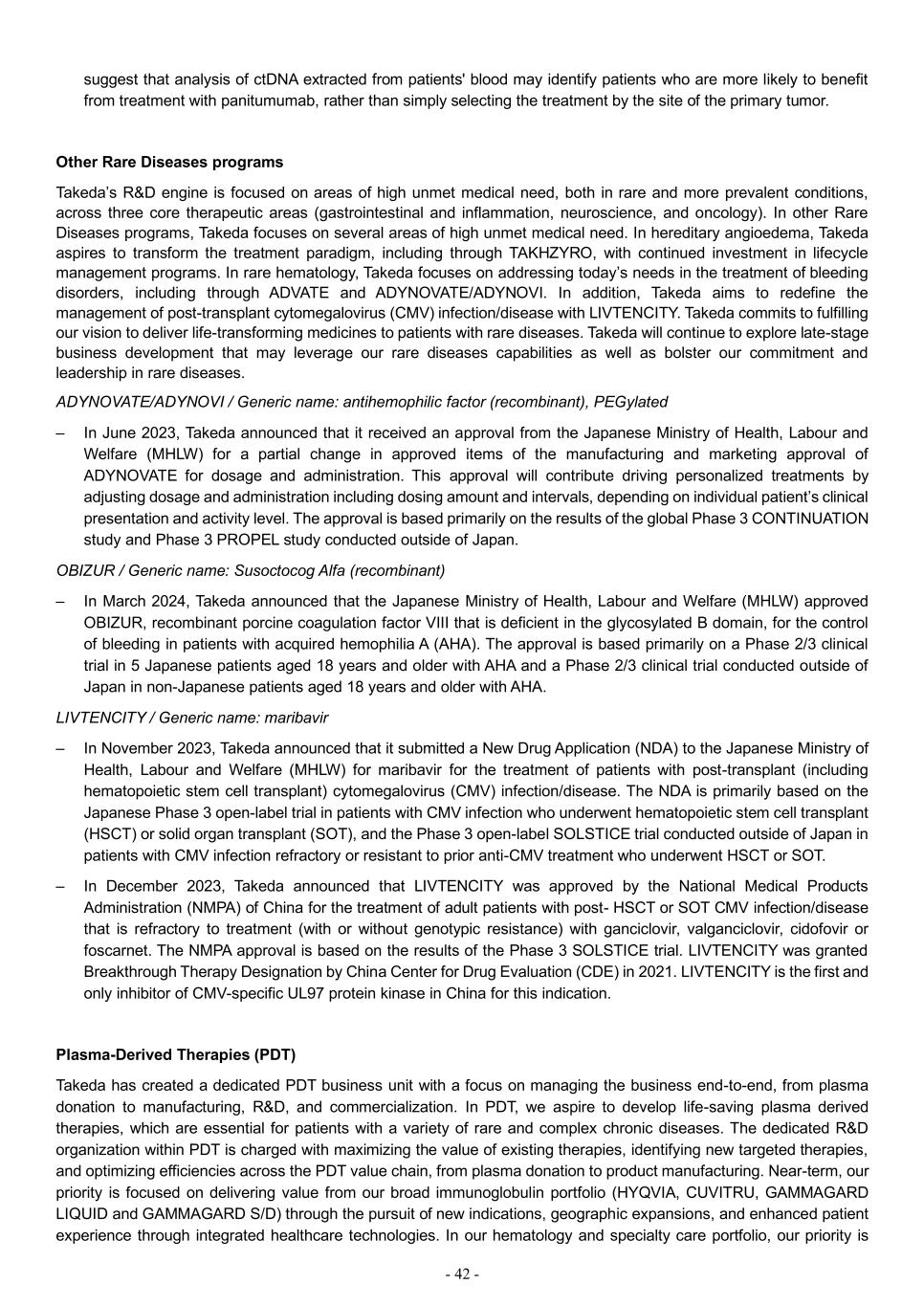 - 42 - suggest that analysis of ctDNA extracted from patients' blood may identify patients who are more likely to benefit from treatment with panitumumab, rather than simply selecting the treatment by the site of the primary tumor. Other Rare Diseases programs Takeda’s R&D engine is focused on areas of high unmet medical need, both in rare and more prevalent conditions, across three core therapeutic areas (gastrointestinal and inflammation, neuroscience, and oncology). In other Rare Diseases programs, Takeda focuses on several areas of high unmet medical need. In hereditary angioedema, Takeda aspires to transform the treatment paradigm, including through TAKHZYRO, with continued investment in lifecycle management programs. In rare hematology, Takeda focuses on addressing today’s needs in the treatment of bleeding disorders, including through ADVATE and ADYNOVATE/ADYNOVI. In addition, Takeda aims to redefine the management of post-transplant cytomegalovirus (CMV) infection/disease with LIVTENCITY. Takeda commits to fulfilling our vision to deliver life-transforming medicines to patients with rare diseases. Takeda will continue to explore late-stage business development that may leverage our rare diseases capabilities as well as bolster our commitment and leadership in rare diseases. ADYNOVATE/ADYNOVI / Generic name: antihemophilic factor (recombinant), PEGylated – In June 2023, Takeda announced that it received an approval from the Japanese Ministry of Health, Labour and Welfare (MHLW) for a partial change in approved items of the manufacturing and marketing approval of ADYNOVATE for dosage and administration. This approval will contribute driving personalized treatments by adjusting dosage and administration including dosing amount and intervals, depending on individual patient’s clinical presentation and activity level. The approval is based primarily on the results of the global Phase 3 CONTINUATION study and Phase 3 PROPEL study conducted outside of Japan. OBIZUR / Generic name: Susoctocog Alfa (recombinant) – In March 2024, Takeda announced that the Japanese Ministry of Health, Labour and Welfare (MHLW) approved OBIZUR, recombinant porcine coagulation factor VIII that is deficient in the glycosylated B domain, for the control of bleeding in patients with acquired hemophilia A (AHA). The approval is based primarily on a Phase 2/3 clinical trial in 5 Japanese patients aged 18 years and older with AHA and a Phase 2/3 clinical trial conducted outside of Japan in non-Japanese patients aged 18 years and older with AHA. LIVTENCITY / Generic name: maribavir – In November 2023, Takeda announced that it submitted a New Drug Application (NDA) to the Japanese Ministry of Health, Labour and Welfare (MHLW) for maribavir for the treatment of patients with post-transplant (including hematopoietic stem cell transplant) cytomegalovirus (CMV) infection/disease. The NDA is primarily based on the Japanese Phase 3 open-label trial in patients with CMV infection who underwent hematopoietic stem cell transplant (HSCT) or solid organ transplant (SOT), and the Phase 3 open-label SOLSTICE trial conducted outside of Japan in patients with CMV infection refractory or resistant to prior anti-CMV treatment who underwent HSCT or SOT. – In December 2023, Takeda announced that LIVTENCITY was approved by the National Medical Products Administration (NMPA) of China for the treatment of adult patients with post- HSCT or SOT CMV infection/disease that is refractory to treatment (with or without genotypic resistance) with ganciclovir, valganciclovir, cidofovir or foscarnet. The NMPA approval is based on the results of the Phase 3 SOLSTICE trial. LIVTENCITY was granted Breakthrough Therapy Designation by China Center for Drug Evaluation (CDE) in 2021. LIVTENCITY is the first and only inhibitor of CMV-specific UL97 protein kinase in China for this indication. Plasma-Derived Therapies (PDT) Takeda has created a dedicated PDT business unit with a focus on managing the business end-to-end, from plasma donation to manufacturing, R&D, and commercialization. In PDT, we aspire to develop life-saving plasma derived therapies, which are essential for patients with a variety of rare and complex chronic diseases. The dedicated R&D organization within PDT is charged with maximizing the value of existing therapies, identifying new targeted therapies, and optimizing efficiencies across the PDT value chain, from plasma donation to product manufacturing. Near-term, our priority is focused on delivering value from our broad immunoglobulin portfolio (HYQVIA, CUVITRU, GAMMAGARD LIQUID and GAMMAGARD S/D) through the pursuit of new indications, geographic expansions, and enhanced patient experience through integrated healthcare technologies. In our hematology and specialty care portfolio, our priority is