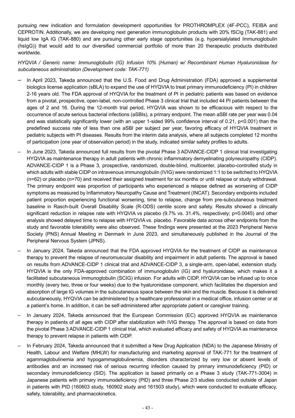 - 43 - pursuing new indication and formulation development opportunities for PROTHROMPLEX (4F-PCC), FEIBA and CEPROTIN. Additionally, we are developing next generation immunoglobulin products with 20% fSCIg (TAK-881) and liquid low IgA IG (TAK-880) and are pursuing other early stage opportunities (e.g. hypersialylated Immunoglobulin (hsIgG)) that would add to our diversified commercial portfolio of more than 20 therapeutic products distributed worldwide. HYQVIA / Generic name: Immunoglobulin (IG) Infusion 10% (Human) w/ Recombinant Human Hyaluronidase for subcutaneous administration (Development code: TAK-771) – In April 2023, Takeda announced that the U.S. Food and Drug Administration (FDA) approved a supplemental biologics license application (sBLA) to expand the use of HYQVIA to treat primary immunodeficiency (PI) in children 2-16 years old. The FDA approval of HYQVIA for the treatment of PI in pediatric patients was based on evidence from a pivotal, prospective, open-label, non-controlled Phase 3 clinical trial that included 44 PI patients between the ages of 2 and 16. During the 12-month trial period, HYQVIA was shown to be efficacious with respect to the occurrence of acute serious bacterial infections (aSBIs), a primary endpoint. The mean aSBI rate per year was 0.04 and was statistically significantly lower (with an upper 1-sided 99% confidence interval of 0.21, p<0.001) than the predefined success rate of less than one aSBI per subject per year, favoring efficacy of HYQVIA treatment in pediatric subjects with PI diseases. Results from the interim data analysis, where all subjects completed 12 months of participation (one year of observation period) in the study, indicated similar safety profiles to adults. – In June 2023, Takeda announced full results from the pivotal Phase 3 ADVANCE-CIDP 1 clinical trial investigating HYQVIA as maintenance therapy in adult patients with chronic inflammatory demyelinating polyneuropathy (CIDP). ADVANCE-CIDP 1 is a Phase 3, prospective, randomized, double-blind, multicenter, placebo-controlled study in which adults with stable CIDP on intravenous immunoglobulin (IVIG) were randomized 1:1 to be switched to HYQVIA (n=62) or placebo (n=70) and received their assigned treatment for six months or until relapse or study withdrawal. The primary endpoint was proportion of participants who experienced a relapse defined as worsening of CIDP symptoms as measured by Inflammatory Neuropathy Cause and Treatment (INCAT). Secondary endpoints included patient proportion experiencing functional worsening, time to relapse, change from pre-subcutaneous treatment baseline in Rasch-built Overall Disability Scale (R-ODS) centile score and safety. Results showed a clinically significant reduction in relapse rate with HYQVIA vs placebo (9.7% vs. 31.4%, respectively; p=0.0045) and other analysis showed delayed time to relapse with HYQVIA vs. placebo. Favorable data across other endpoints from the study and favorable tolerability were also observed. These findings were presented at the 2023 Peripheral Nerve Society (PNS) Annual Meeting in Denmark in June 2023, and simultaneously published in the Journal of the Peripheral Nervous System (JPNS). – In January 2024, Takeda announced that the FDA approved HYQVIA for the treatment of CIDP as maintenance therapy to prevent the relapse of neuromuscular disability and impairment in adult patients. The approval is based on results from ADVANCE-CIDP 1 clinical trial and ADVANCE-CIDP 3, a single-arm, open-label, extension study. HYQVIA is the only FDA-approved combination of immunoglobulin (IG) and hyaluronidase, which makes it a facilitated subcutaneous immunoglobulin (SCIG) infusion. For adults with CIDP, HYQVIA can be infused up to once monthly (every two, three or four weeks) due to the hyaluronidase component, which facilitates the dispersion and absorption of large IG volumes in the subcutaneous space between the skin and the muscle. Because it is delivered subcutaneously, HYQVIA can be administered by a healthcare professional in a medical office, infusion center or at a patient’s home. In addition, it can be self-administered after appropriate patient or caregiver training. – In January 2024, Takeda announced that the European Commission (EC) approved HYQVIA as maintenance therapy in patients of all ages with CIDP after stabilization with IVIG therapy. The approval is based on data from the pivotal Phase 3 ADVANCE-CIDP 1 clinical trial, which evaluated efficacy and safety of HYQVIA as maintenance therapy to prevent relapse in patients with CIDP. – In February 2024, Takeda announced that it submitted a New Drug Application (NDA) to the Japanese Ministry of Health, Labour and Welfare (MHLW) for manufacturing and marketing approval of TAK-771 for the treatment of agammaglobulinemia and hypogammaglobulinemia, disorders characterized by very low or absent levels of antibodies and an increased risk of serious recurring infection caused by primary immunodeficiency (PID) or secondary immunodeficiency (SID). The application is based primarily on a Phase 3 study (TAK-771-3004) in Japanese patients with primary immunodeficiency (PID) and three Phase 2/3 studies conducted outside of Japan in patients with PID (160603 study, 160902 study and 161503 study), which were conducted to evaluate efficacy, safety, tolerability, and pharmacokinetics.