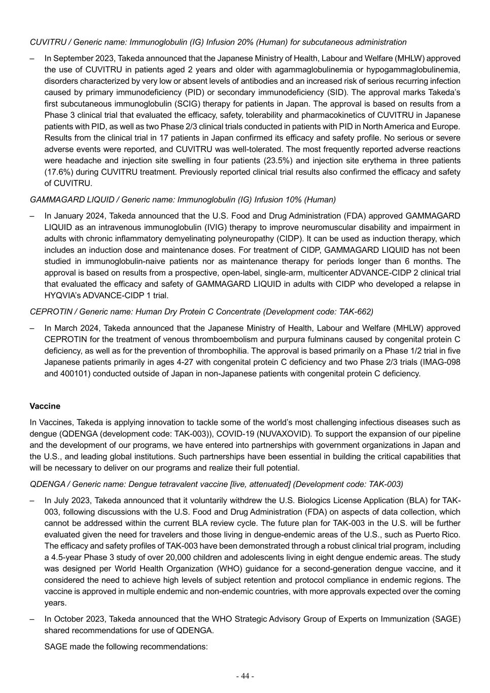- 44 - CUVITRU / Generic name: Immunoglobulin (IG) Infusion 20% (Human) for subcutaneous administration – In September 2023, Takeda announced that the Japanese Ministry of Health, Labour and Welfare (MHLW) approved the use of CUVITRU in patients aged 2 years and older with agammaglobulinemia or hypogammaglobulinemia, disorders characterized by very low or absent levels of antibodies and an increased risk of serious recurring infection caused by primary immunodeficiency (PID) or secondary immunodeficiency (SID). The approval marks Takeda’s first subcutaneous immunoglobulin (SCIG) therapy for patients in Japan. The approval is based on results from a Phase 3 clinical trial that evaluated the efficacy, safety, tolerability and pharmacokinetics of CUVITRU in Japanese patients with PID, as well as two Phase 2/3 clinical trials conducted in patients with PID in North America and Europe. Results from the clinical trial in 17 patients in Japan confirmed its efficacy and safety profile. No serious or severe adverse events were reported, and CUVITRU was well-tolerated. The most frequently reported adverse reactions were headache and injection site swelling in four patients (23.5%) and injection site erythema in three patients (17.6%) during CUVITRU treatment. Previously reported clinical trial results also confirmed the efficacy and safety of CUVITRU. GAMMAGARD LIQUID / Generic name: Immunoglobulin (IG) Infusion 10% (Human) – In January 2024, Takeda announced that the U.S. Food and Drug Administration (FDA) approved GAMMAGARD LIQUID as an intravenous immunoglobulin (IVIG) therapy to improve neuromuscular disability and impairment in adults with chronic inflammatory demyelinating polyneuropathy (CIDP). It can be used as induction therapy, which includes an induction dose and maintenance doses. For treatment of CIDP, GAMMAGARD LIQUID has not been studied in immunoglobulin-naive patients nor as maintenance therapy for periods longer than 6 months. The approval is based on results from a prospective, open-label, single-arm, multicenter ADVANCE-CIDP 2 clinical trial that evaluated the efficacy and safety of GAMMAGARD LIQUID in adults with CIDP who developed a relapse in HYQVIA’s ADVANCE-CIDP 1 trial. CEPROTIN / Generic name: Human Dry Protein C Concentrate (Development code: TAK-662) – In March 2024, Takeda announced that the Japanese Ministry of Health, Labour and Welfare (MHLW) approved CEPROTIN for the treatment of venous thromboembolism and purpura fulminans caused by congenital protein C deficiency, as well as for the prevention of thrombophilia. The approval is based primarily on a Phase 1/2 trial in five Japanese patients primarily in ages 4-27 with congenital protein C deficiency and two Phase 2/3 trials (IMAG-098 and 400101) conducted outside of Japan in non-Japanese patients with congenital protein C deficiency. Vaccine In Vaccines, Takeda is applying innovation to tackle some of the world’s most challenging infectious diseases such as dengue (QDENGA (development code: TAK-003)), COVID-19 (NUVAXOVID). To support the expansion of our pipeline and the development of our programs, we have entered into partnerships with government organizations in Japan and the U.S., and leading global institutions. Such partnerships have been essential in building the critical capabilities that will be necessary to deliver on our programs and realize their full potential. QDENGA / Generic name: Dengue tetravalent vaccine [live, attenuated] (Development code: TAK-003) – In July 2023, Takeda announced that it voluntarily withdrew the U.S. Biologics License Application (BLA) for TAK- 003, following discussions with the U.S. Food and Drug Administration (FDA) on aspects of data collection, which cannot be addressed within the current BLA review cycle. The future plan for TAK-003 in the U.S. will be further evaluated given the need for travelers and those living in dengue-endemic areas of the U.S., such as Puerto Rico. The efficacy and safety profiles of TAK-003 have been demonstrated through a robust clinical trial program, including a 4.5-year Phase 3 study of over 20,000 children and adolescents living in eight dengue endemic areas. The study was designed per World Health Organization (WHO) guidance for a second-generation dengue vaccine, and it considered the need to achieve high levels of subject retention and protocol compliance in endemic regions. The vaccine is approved in multiple endemic and non-endemic countries, with more approvals expected over the coming years. – In October 2023, Takeda announced that the WHO Strategic Advisory Group of Experts on Immunization (SAGE) shared recommendations for use of QDENGA. SAGE made the following recommendations: