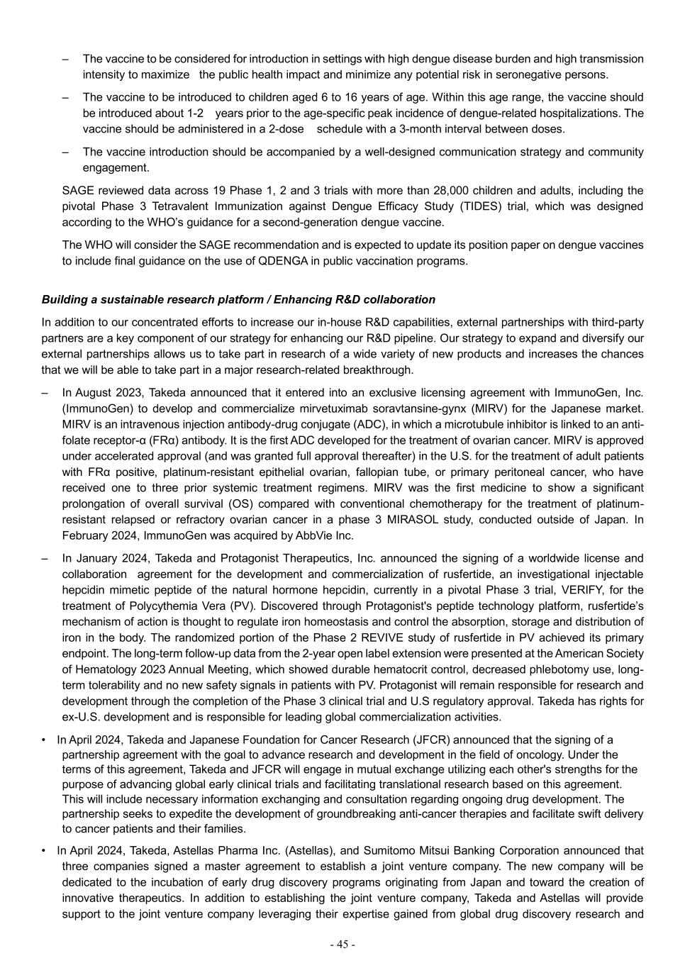 - 45 - – The vaccine to be considered for introduction in settings with high dengue disease burden and high transmission intensity to maximize the public health impact and minimize any potential risk in seronegative persons. – The vaccine to be introduced to children aged 6 to 16 years of age. Within this age range, the vaccine should be introduced about 1-2 years prior to the age-specific peak incidence of dengue-related hospitalizations. The vaccine should be administered in a 2-dose schedule with a 3-month interval between doses. – The vaccine introduction should be accompanied by a well-designed communication strategy and community engagement. SAGE reviewed data across 19 Phase 1, 2 and 3 trials with more than 28,000 children and adults, including the pivotal Phase 3 Tetravalent Immunization against Dengue Efficacy Study (TIDES) trial, which was designed according to the WHO’s guidance for a second-generation dengue vaccine. The WHO will consider the SAGE recommendation and is expected to update its position paper on dengue vaccines to include final guidance on the use of QDENGA in public vaccination programs. Building a sustainable research platform / Enhancing R&D collaboration In addition to our concentrated efforts to increase our in-house R&D capabilities, external partnerships with third-party partners are a key component of our strategy for enhancing our R&D pipeline. Our strategy to expand and diversify our external partnerships allows us to take part in research of a wide variety of new products and increases the chances that we will be able to take part in a major research-related breakthrough. – In August 2023, Takeda announced that it entered into an exclusive licensing agreement with ImmunoGen, Inc. (ImmunoGen) to develop and commercialize mirvetuximab soravtansine-gynx (MIRV) for the Japanese market. MIRV is an intravenous injection antibody-drug conjugate (ADC), in which a microtubule inhibitor is linked to an anti- folate receptor-α (FRα) antibody. It is the first ADC developed for the treatment of ovarian cancer. MIRV is approved under accelerated approval (and was granted full approval thereafter) in the U.S. for the treatment of adult patients with FRα positive, platinum-resistant epithelial ovarian, fallopian tube, or primary peritoneal cancer, who have received one to three prior systemic treatment regimens. MIRV was the first medicine to show a significant prolongation of overall survival (OS) compared with conventional chemotherapy for the treatment of platinum- resistant relapsed or refractory ovarian cancer in a phase 3 MIRASOL study, conducted outside of Japan. In February 2024, ImmunoGen was acquired by AbbVie Inc. – In January 2024, Takeda and Protagonist Therapeutics, Inc. announced the signing of a worldwide license and collaboration agreement for the development and commercialization of rusfertide, an investigational injectable hepcidin mimetic peptide of the natural hormone hepcidin, currently in a pivotal Phase 3 trial, VERIFY, for the treatment of Polycythemia Vera (PV). Discovered through Protagonist's peptide technology platform, rusfertide’s mechanism of action is thought to regulate iron homeostasis and control the absorption, storage and distribution of iron in the body. The randomized portion of the Phase 2 REVIVE study of rusfertide in PV achieved its primary endpoint. The long-term follow-up data from the 2-year open label extension were presented at the American Society of Hematology 2023 Annual Meeting, which showed durable hematocrit control, decreased phlebotomy use, long- term tolerability and no new safety signals in patients with PV. Protagonist will remain responsible for research and development through the completion of the Phase 3 clinical trial and U.S regulatory approval. Takeda has rights for ex-U.S. development and is responsible for leading global commercialization activities. • In April 2024, Takeda and Japanese Foundation for Cancer Research (JFCR) announced that the signing of a partnership agreement with the goal to advance research and development in the field of oncology. Under the terms of this agreement, Takeda and JFCR will engage in mutual exchange utilizing each other's strengths for the purpose of advancing global early clinical trials and facilitating translational research based on this agreement. This will include necessary information exchanging and consultation regarding ongoing drug development. The partnership seeks to expedite the development of groundbreaking anti-cancer therapies and facilitate swift delivery to cancer patients and their families. • In April 2024, Takeda, Astellas Pharma Inc. (Astellas), and Sumitomo Mitsui Banking Corporation announced that three companies signed a master agreement to establish a joint venture company. The new company will be dedicated to the incubation of early drug discovery programs originating from Japan and toward the creation of innovative therapeutics. In addition to establishing the joint venture company, Takeda and Astellas will provide support to the joint venture company leveraging their expertise gained from global drug discovery research and