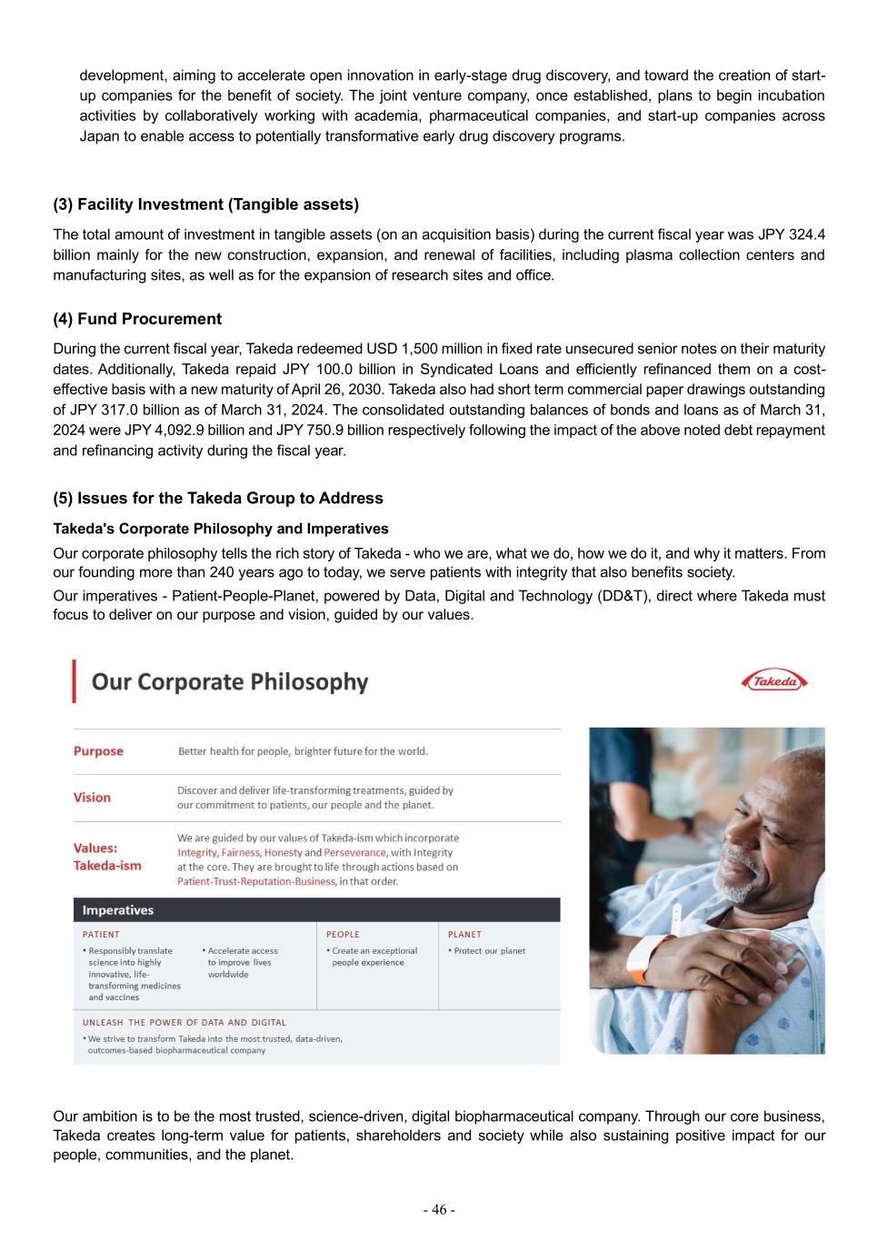 - 46 - development, aiming to accelerate open innovation in early-stage drug discovery, and toward the creation of start- up companies for the benefit of society. The joint venture company, once established, plans to begin incubation activities by collaboratively working with academia, pharmaceutical companies, and start-up companies across Japan to enable access to potentially transformative early drug discovery programs. (3) Facility Investment (Tangible assets) The total amount of investment in tangible assets (on an acquisition basis) during the current fiscal year was JPY 324.4 billion mainly for the new construction, expansion, and renewal of facilities, including plasma collection centers and manufacturing sites, as well as for the expansion of research sites and office. (4) Fund Procurement During the current fiscal year, Takeda redeemed USD 1,500 million in fixed rate unsecured senior notes on their maturity dates. Additionally, Takeda repaid JPY 100.0 billion in Syndicated Loans and efficiently refinanced them on a cost- effective basis with a new maturity of April 26, 2030. Takeda also had short term commercial paper drawings outstanding of JPY 317.0 billion as of March 31, 2024. The consolidated outstanding balances of bonds and loans as of March 31, 2024 were JPY 4,092.9 billion and JPY 750.9 billion respectively following the impact of the above noted debt repayment and refinancing activity during the fiscal year. (5) Issues for the Takeda Group to Address Takeda's Corporate Philosophy and Imperatives Our corporate philosophy tells the rich story of Takeda - who we are, what we do, how we do it, and why it matters. From our founding more than 240 years ago to today, we serve patients with integrity that also benefits society. Our imperatives - Patient-People-Planet, powered by Data, Digital and Technology (DD&T), direct where Takeda must focus to deliver on our purpose and vision, guided by our values. Our ambition is to be the most trusted, science-driven, digital biopharmaceutical company. Through our core business, Takeda creates long-term value for patients, shareholders and society while also sustaining positive impact for our people, communities, and the planet.