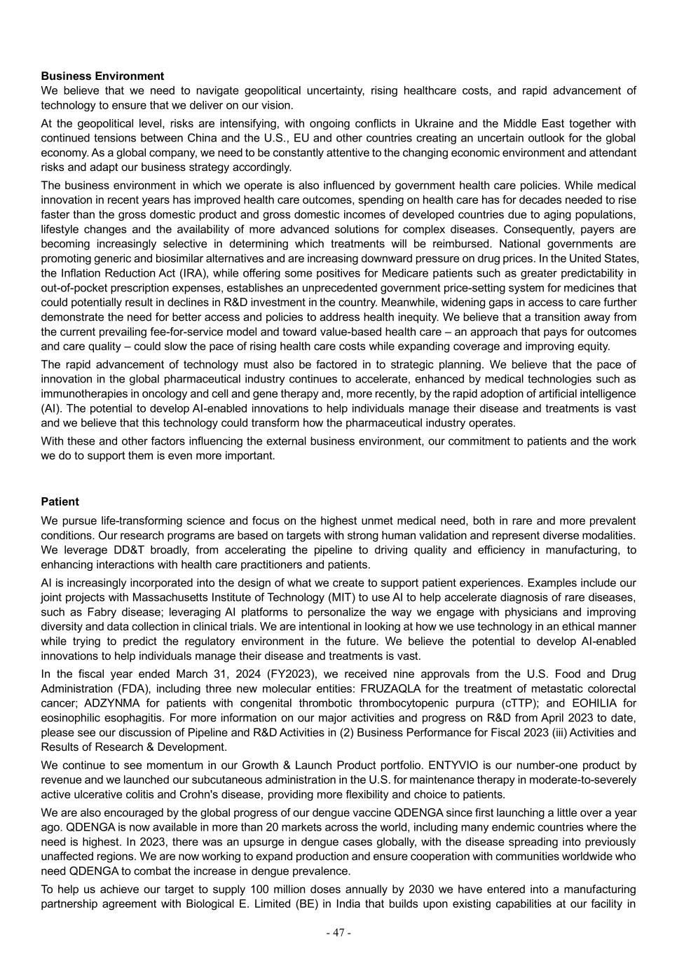 - 47 - Business Environment We believe that we need to navigate geopolitical uncertainty, rising healthcare costs, and rapid advancement of technology to ensure that we deliver on our vision. At the geopolitical level, risks are intensifying, with ongoing conflicts in Ukraine and the Middle East together with continued tensions between China and the U.S., EU and other countries creating an uncertain outlook for the global economy. As a global company, we need to be constantly attentive to the changing economic environment and attendant risks and adapt our business strategy accordingly. The business environment in which we operate is also influenced by government health care policies. While medical innovation in recent years has improved health care outcomes, spending on health care has for decades needed to rise faster than the gross domestic product and gross domestic incomes of developed countries due to aging populations, lifestyle changes and the availability of more advanced solutions for complex diseases. Consequently, payers are becoming increasingly selective in determining which treatments will be reimbursed. National governments are promoting generic and biosimilar alternatives and are increasing downward pressure on drug prices. In the United States, the Inflation Reduction Act (IRA), while offering some positives for Medicare patients such as greater predictability in out-of-pocket prescription expenses, establishes an unprecedented government price-setting system for medicines that could potentially result in declines in R&D investment in the country. Meanwhile, widening gaps in access to care further demonstrate the need for better access and policies to address health inequity. We believe that a transition away from the current prevailing fee-for-service model and toward value-based health care – an approach that pays for outcomes and care quality – could slow the pace of rising health care costs while expanding coverage and improving equity. The rapid advancement of technology must also be factored in to strategic planning. We believe that the pace of innovation in the global pharmaceutical industry continues to accelerate, enhanced by medical technologies such as immunotherapies in oncology and cell and gene therapy and, more recently, by the rapid adoption of artificial intelligence (AI). The potential to develop AI-enabled innovations to help individuals manage their disease and treatments is vast and we believe that this technology could transform how the pharmaceutical industry operates. With these and other factors influencing the external business environment, our commitment to patients and the work we do to support them is even more important. Patient We pursue life-transforming science and focus on the highest unmet medical need, both in rare and more prevalent conditions. Our research programs are based on targets with strong human validation and represent diverse modalities. We leverage DD&T broadly, from accelerating the pipeline to driving quality and efficiency in manufacturing, to enhancing interactions with health care practitioners and patients. AI is increasingly incorporated into the design of what we create to support patient experiences. Examples include our joint projects with Massachusetts Institute of Technology (MIT) to use AI to help accelerate diagnosis of rare diseases, such as Fabry disease; leveraging AI platforms to personalize the way we engage with physicians and improving diversity and data collection in clinical trials. We are intentional in looking at how we use technology in an ethical manner while trying to predict the regulatory environment in the future. We believe the potential to develop AI-enabled innovations to help individuals manage their disease and treatments is vast. In the fiscal year ended March 31, 2024 (FY2023), we received nine approvals from the U.S. Food and Drug Administration (FDA), including three new molecular entities: FRUZAQLA for the treatment of metastatic colorectal cancer; ADZYNMA for patients with congenital thrombotic thrombocytopenic purpura (cTTP); and EOHILIA for eosinophilic esophagitis. For more information on our major activities and progress on R&D from April 2023 to date, please see our discussion of Pipeline and R&D Activities in (2) Business Performance for Fiscal 2023 (iii) Activities and Results of Research & Development. We continue to see momentum in our Growth & Launch Product portfolio. ENTYVIO is our number-one product by revenue and we launched our subcutaneous administration in the U.S. for maintenance therapy in moderate-to-severely active ulcerative colitis and Crohn's disease, providing more flexibility and choice to patients. We are also encouraged by the global progress of our dengue vaccine QDENGA since first launching a little over a year ago. QDENGA is now available in more than 20 markets across the world, including many endemic countries where the need is highest. In 2023, there was an upsurge in dengue cases globally, with the disease spreading into previously unaffected regions. We are now working to expand production and ensure cooperation with communities worldwide who need QDENGA to combat the increase in dengue prevalence. To help us achieve our target to supply 100 million doses annually by 2030 we have entered into a manufacturing partnership agreement with Biological E. Limited (BE) in India that builds upon existing capabilities at our facility in