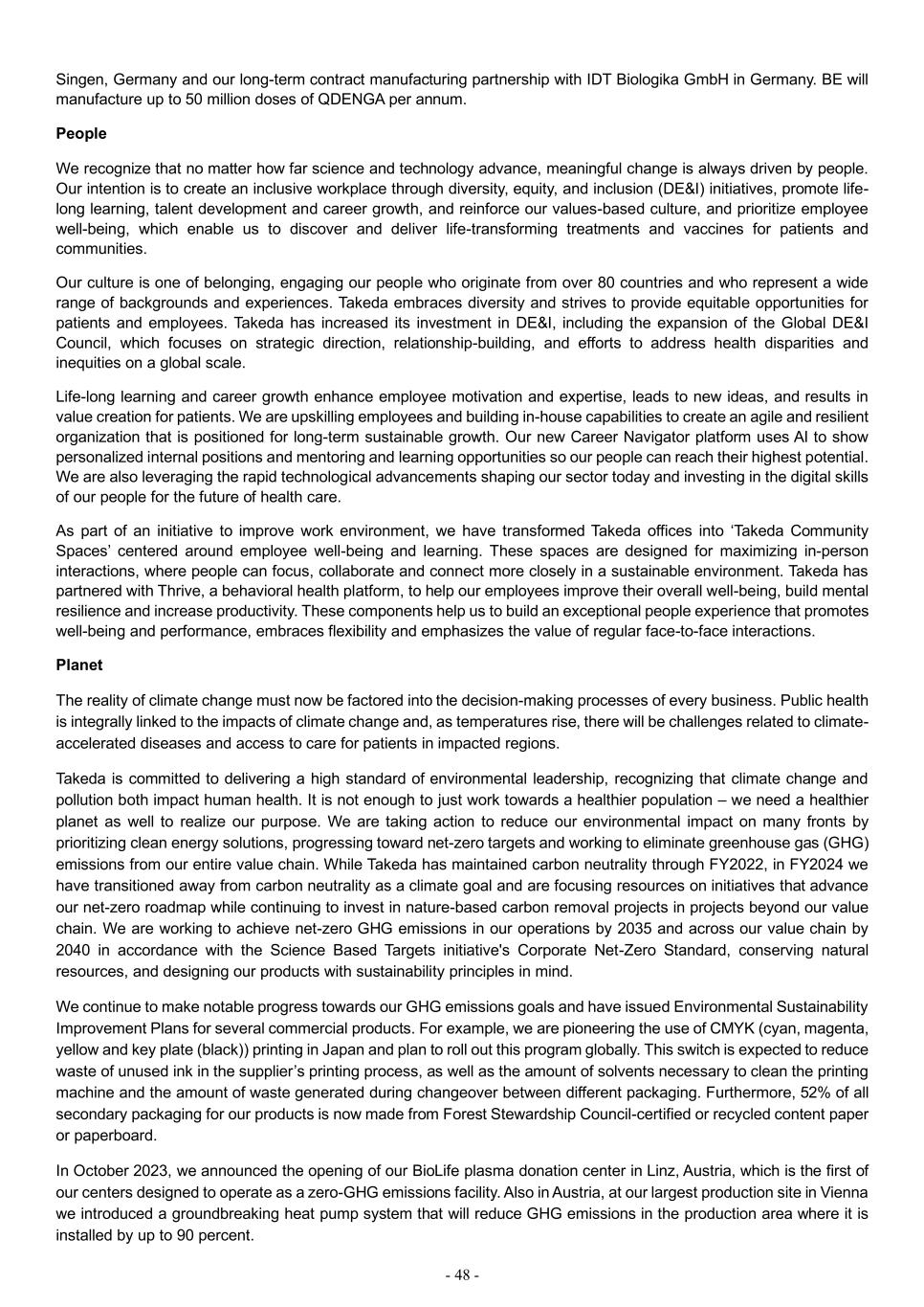 - 48 - Singen, Germany and our long-term contract manufacturing partnership with IDT Biologika GmbH in Germany. BE will manufacture up to 50 million doses of QDENGA per annum. People We recognize that no matter how far science and technology advance, meaningful change is always driven by people. Our intention is to create an inclusive workplace through diversity, equity, and inclusion (DE&I) initiatives, promote life- long learning, talent development and career growth, and reinforce our values-based culture, and prioritize employee well-being, which enable us to discover and deliver life-transforming treatments and vaccines for patients and communities. Our culture is one of belonging, engaging our people who originate from over 80 countries and who represent a wide range of backgrounds and experiences. Takeda embraces diversity and strives to provide equitable opportunities for patients and employees. Takeda has increased its investment in DE&I, including the expansion of the Global DE&I Council, which focuses on strategic direction, relationship-building, and efforts to address health disparities and inequities on a global scale. Life-long learning and career growth enhance employee motivation and expertise, leads to new ideas, and results in value creation for patients. We are upskilling employees and building in-house capabilities to create an agile and resilient organization that is positioned for long-term sustainable growth. Our new Career Navigator platform uses AI to show personalized internal positions and mentoring and learning opportunities so our people can reach their highest potential. We are also leveraging the rapid technological advancements shaping our sector today and investing in the digital skills of our people for the future of health care. As part of an initiative to improve work environment, we have transformed Takeda offices into ‘Takeda Community Spaces’ centered around employee well-being and learning. These spaces are designed for maximizing in-person interactions, where people can focus, collaborate and connect more closely in a sustainable environment. Takeda has partnered with Thrive, a behavioral health platform, to help our employees improve their overall well-being, build mental resilience and increase productivity. These components help us to build an exceptional people experience that promotes well-being and performance, embraces flexibility and emphasizes the value of regular face-to-face interactions. Planet The reality of climate change must now be factored into the decision-making processes of every business. Public health is integrally linked to the impacts of climate change and, as temperatures rise, there will be challenges related to climate- accelerated diseases and access to care for patients in impacted regions. Takeda is committed to delivering a high standard of environmental leadership, recognizing that climate change and pollution both impact human health. It is not enough to just work towards a healthier population – we need a healthier planet as well to realize our purpose. We are taking action to reduce our environmental impact on many fronts by prioritizing clean energy solutions, progressing toward net-zero targets and working to eliminate greenhouse gas (GHG) emissions from our entire value chain. While Takeda has maintained carbon neutrality through FY2022, in FY2024 we have transitioned away from carbon neutrality as a climate goal and are focusing resources on initiatives that advance our net-zero roadmap while continuing to invest in nature-based carbon removal projects in projects beyond our value chain. We are working to achieve net-zero GHG emissions in our operations by 2035 and across our value chain by 2040 in accordance with the Science Based Targets initiative's Corporate Net-Zero Standard, conserving natural resources, and designing our products with sustainability principles in mind. We continue to make notable progress towards our GHG emissions goals and have issued Environmental Sustainability Improvement Plans for several commercial products. For example, we are pioneering the use of CMYK (cyan, magenta, yellow and key plate (black)) printing in Japan and plan to roll out this program globally. This switch is expected to reduce waste of unused ink in the supplier’s printing process, as well as the amount of solvents necessary to clean the printing machine and the amount of waste generated during changeover between different packaging. Furthermore, 52% of all secondary packaging for our products is now made from Forest Stewardship Council-certified or recycled content paper or paperboard. In October 2023, we announced the opening of our BioLife plasma donation center in Linz, Austria, which is the first of our centers designed to operate as a zero-GHG emissions facility. Also in Austria, at our largest production site in Vienna we introduced a groundbreaking heat pump system that will reduce GHG emissions in the production area where it is installed by up to 90 percent.