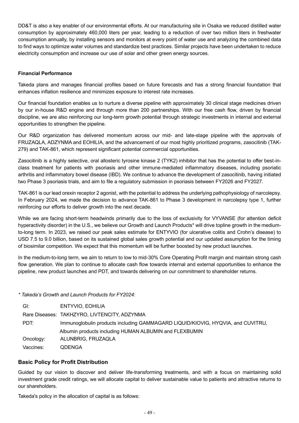- 49 - DD&T is also a key enabler of our environmental efforts. At our manufacturing site in Osaka we reduced distilled water consumption by approximately 460,000 liters per year, leading to a reduction of over two million liters in freshwater consumption annually, by installing sensors and monitors at every point of water use and analyzing the combined data to find ways to optimize water volumes and standardize best practices. Similar projects have been undertaken to reduce electricity consumption and increase our use of solar and other green energy sources. Financial Performance Takeda plans and manages financial profiles based on future forecasts and has a strong financial foundation that enhances inflation resilience and minimizes exposure to interest rate increases. Our financial foundation enables us to nurture a diverse pipeline with approximately 30 clinical stage medicines driven by our in-house R&D engine and through more than 200 partnerships. With our free cash flow, driven by financial discipline, we are also reinforcing our long-term growth potential through strategic investments in internal and external opportunities to strengthen the pipeline. Our R&D organization has delivered momentum across our mid- and late-stage pipeline with the approvals of FRUZAQLA, ADZYNMA and EOHILIA, and the advancement of our most highly prioritized programs, zasocitinib (TAK- 279) and TAK-861, which represent significant potential commercial opportunities. Zasocitinib is a highly selective, oral allosteric tyrosine kinase 2 (TYK2) inhibitor that has the potential to offer best-in- class treatment for patients with psoriasis and other immune-mediated inflammatory diseases, including psoriatic arthritis and inflammatory bowel disease (IBD). We continue to advance the development of zasocitinib, having initiated two Phase 3 psoriasis trials, and aim to file a regulatory submission in psoriasis between FY2026 and FY2027. TAK-861 is our lead orexin receptor 2 agonist, with the potential to address the underlying pathophysiology of narcolepsy. In February 2024, we made the decision to advance TAK-861 to Phase 3 development in narcolepsy type 1, further reinforcing our efforts to deliver growth into the next decade. While we are facing short-term headwinds primarily due to the loss of exclusivity for VYVANSE (for attention deficit hyperactivity disorder) in the U.S., we believe our Growth and Launch Products* will drive topline growth in the medium- to-long term. In 2023, we raised our peak sales estimate for ENTYVIO (for ulcerative colitis and Crohn’s disease) to USD 7.5 to 9.0 billion, based on its sustained global sales growth potential and our updated assumption for the timing of biosimilar competition. We expect that this momentum will be further boosted by new product launches. In the medium-to-long term, we aim to return to low to mid-30% Core Operating Profit margin and maintain strong cash flow generation. We plan to continue to allocate cash flow towards internal and external opportunities to enhance the pipeline, new product launches and PDT, and towards delivering on our commitment to shareholder returns. * Takeda’s Growth and Launch Products for FY2024: GI: ENTYVIO, EOHILIA Rare Diseases: TAKHZYRO, LIVTENCITY, ADZYNMA PDT: Immunoglobulin products including GAMMAGARD LIQUID/KIOVIG, HYQVIA, and CUVITRU, Albumin products including HUMAN ALBUMIN and FLEXBUMIN Oncology: ALUNBRIG, FRUZAQLA Vaccines: QDENGA Basic Policy for Profit Distribution Guided by our vision to discover and deliver life-transforming treatments, and with a focus on maintaining solid investment grade credit ratings, we will allocate capital to deliver sustainable value to patients and attractive returns to our shareholders. Takeda's policy in the allocation of capital is as follows: