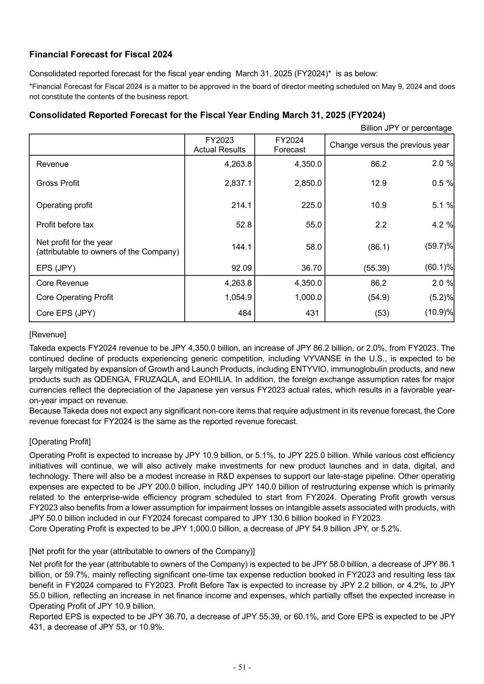 - 51 - Financial Forecast for Fiscal 2024 Consolidated reported forecast for the fiscal year ending March 31, 2025 (FY2024)* is as below: *Financial Forecast for Fiscal 2024 is a matter to be approved in the board of director meeting scheduled on May 9, 2024 and does not constitute the contents of the business report. Consolidated Reported Forecast for the Fiscal Year Ending March 31, 2025 (FY2024) Billion JPY or percentage FY2023 Actual Results FY2024 Forecast Change versus the previous year Revenue 4,263.8 4,350.0 86.2 2.0 % Gross Profit 2,837.1 2,850.0 12.9 0.5 % Operating profit 214.1 225.0 10.9 5.1 % Profit before tax 52.8 55.0 2.2 4.2 % Net profit for the year (attributable to owners of the Company) 144.1 58.0 (86.1) (59.7)% EPS (JPY) 92.09 36.70 (55.39) (60.1)% Core Revenue 4,263.8 4,350.0 86.2 2.0 % Core Operating Profit 1,054.9 1,000.0 (54.9) (5.2)% Core EPS (JPY) 484 431 (53) (10.9)% [Revenue] Takeda expects FY2024 revenue to be JPY 4,350.0 billion, an increase of JPY 86.2 billion, or 2.0%, from FY2023. The continued decline of products experiencing generic competition, including VYVANSE in the U.S., is expected to be largely mitigated by expansion of Growth and Launch Products, including ENTYVIO, immunoglobulin products, and new products such as QDENGA, FRUZAQLA, and EOHILIA. In addition, the foreign exchange assumption rates for major currencies reflect the depreciation of the Japanese yen versus FY2023 actual rates, which results in a favorable year- on-year impact on revenue. Because Takeda does not expect any significant non-core items that require adjustment in its revenue forecast, the Core revenue forecast for FY2024 is the same as the reported revenue forecast. [Operating Profit] Operating Profit is expected to increase by JPY 10.9 billion, or 5.1%, to JPY 225.0 billion. While various cost efficiency initiatives will continue, we will also actively make investments for new product launches and in data, digital, and technology. There will also be a modest increase in R&D expenses to support our late-stage pipeline. Other operating expenses are expected to be JPY 200.0 billion, including JPY 140.0 billion of restructuring expense which is primarily related to the enterprise-wide efficiency program scheduled to start from FY2024. Operating Profit growth versus FY2023 also benefits from a lower assumption for impairment losses on intangible assets associated with products, with JPY 50.0 billion included in our FY2024 forecast compared to JPY 130.6 billion booked in FY2023. Core Operating Profit is expected to be JPY 1,000.0 billion, a decrease of JPY 54.9 billion JPY, or 5.2%. [Net profit for the year (attributable to owners of the Company)] Net profit for the year (attributable to owners of the Company) is expected to be JPY 58.0 billion, a decrease of JPY 86.1 billion, or 59.7%, mainly reflecting significant one-time tax expense reduction booked in FY2023 and resulting less tax benefit in FY2024 compared to FY2023. Profit Before Tax is expected to increase by JPY 2.2 billion, or 4.2%, to JPY 55.0 billion, reflecting an increase in net finance income and expenses, which partially offset the expected increase in Operating Profit of JPY 10.9 billion. Reported EPS is expected to be JPY 36.70, a decrease of JPY 55.39, or 60.1%, and Core EPS is expected to be JPY 431, a decrease of JPY 53, or 10.9%.