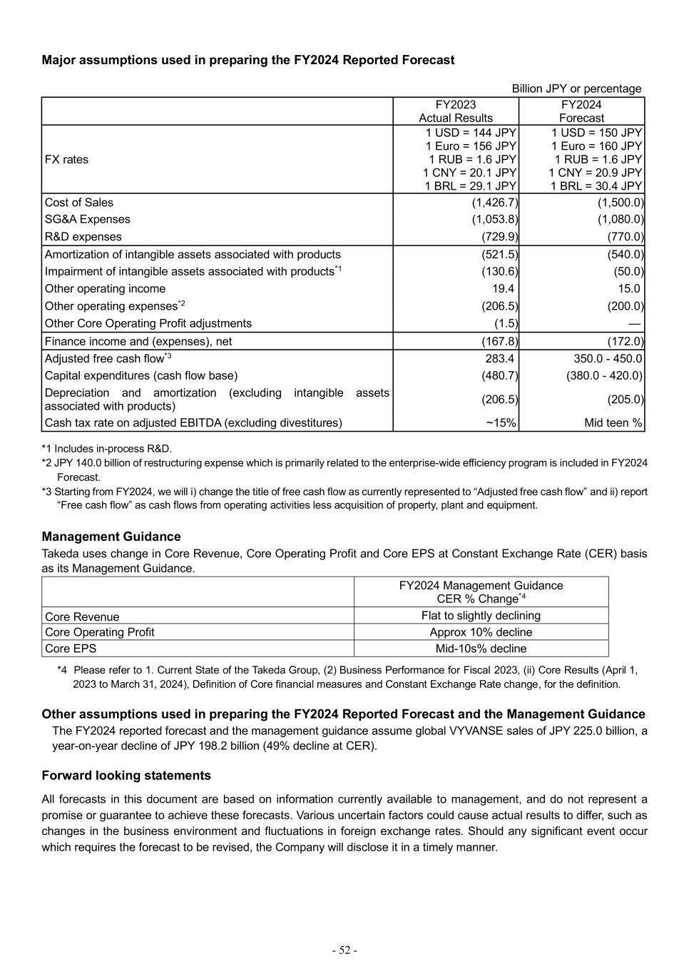 - 52 - Major assumptions used in preparing the FY2024 Reported Forecast Billion JPY or percentage FY2023 Actual Results FY2024 Forecast FX rates 1 USD = 144 JPY 1 Euro = 156 JPY 1 RUB = 1.6 JPY 1 CNY = 20.1 JPY 1 BRL = 29.1 JPY 1 USD = 150 JPY 1 Euro = 160 JPY 1 RUB = 1.6 JPY 1 CNY = 20.9 JPY 1 BRL = 30.4 JPY Cost of Sales (1,426.7) (1,500.0) SG&A Expenses (1,053.8) (1,080.0) R&D expenses (729.9) (770.0) Amortization of intangible assets associated with products (521.5) (540.0) Impairment of intangible assets associated with products*1 (130.6) (50.0) Other operating income 19.4 15.0 Other operating expenses*2 (206.5) (200.0) Other Core Operating Profit adjustments (1.5) — Finance income and (expenses), net (167.8) (172.0) Adjusted free cash flow*3 283.4 350.0 - 450.0 Capital expenditures (cash flow base) (480.7) (380.0 - 420.0) Depreciation and amortization (excluding intangible assets associated with products) (206.5) (205.0) Cash tax rate on adjusted EBITDA (excluding divestitures) ~15% Mid teen % *1 Includes in-process R&D. *2 JPY 140.0 billion of restructuring expense which is primarily related to the enterprise-wide efficiency program is included in FY2024 Forecast. *3 Starting from FY2024, we will i) change the title of free cash flow as currently represented to “Adjusted free cash flow” and ii) report “Free cash flow” as cash flows from operating activities less acquisition of property, plant and equipment. Management Guidance Takeda uses change in Core Revenue, Core Operating Profit and Core EPS at Constant Exchange Rate (CER) basis as its Management Guidance. FY2024 Management Guidance CER % Change*4 Core Revenue Flat to slightly declining Core Operating Profit Approx 10% decline Core EPS Mid-10s% decline *4 Please refer to 1. Current State of the Takeda Group, (2) Business Performance for Fiscal 2023, (ii) Core Results (April 1, 2023 to March 31, 2024), Definition of Core financial measures and Constant Exchange Rate change, for the definition. Other assumptions used in preparing the FY2024 Reported Forecast and the Management Guidance The FY2024 reported forecast and the management guidance assume global VYVANSE sales of JPY 225.0 billion, a year-on-year decline of JPY 198.2 billion (49% decline at CER). Forward looking statements All forecasts in this document are based on information currently available to management, and do not represent a promise or guarantee to achieve these forecasts. Various uncertain factors could cause actual results to differ, such as changes in the business environment and fluctuations in foreign exchange rates. Should any significant event occur which requires the forecast to be revised, the Company will disclose it in a timely manner.