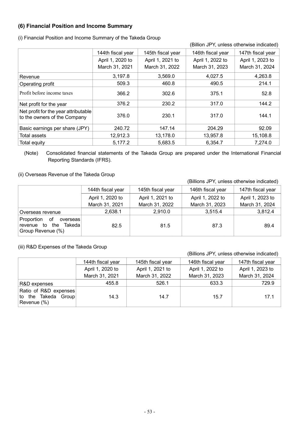- 53 - (6) Financial Position and Income Summary (i) Financial Position and Income Summary of the Takeda Group (Billion JPY, unless otherwise indicated) 144th fiscal year 145th fiscal year 146th fiscal year 147th fiscal year April 1, 2020 to March 31, 2021 April 1, 2021 to March 31, 2022 April 1, 2022 to March 31, 2023 April 1, 2023 to March 31, 2024 Revenue 3,197.8 3,569.0 4,027.5 4,263.8 Operating profit 509.3 460.8 490.5 214.1 Profit before income taxes 366.2 302.6 375.1 52.8 Net profit for the year 376.2 230.2 317.0 144.2 Net profit for the year attributable to the owners of the Company 376.0 230.1 317.0 144.1 Basic earnings per share (JPY) 240.72 147.14 204.29 92.09 Total assets 12,912.3 13,178.0 13,957.8 15,108.8 Total equity 5,177.2 5,683.5 6,354.7 7,274.0 (Note) Consolidated financial statements of the Takeda Group are prepared under the International Financial Reporting Standards (IFRS). (ii) Overseas Revenue of the Takeda Group (Billions JPY, unless otherwise indicated) 144th fiscal year 145th fiscal year 146th fiscal year 147th fiscal year April 1, 2020 to March 31, 2021 April 1, 2021 to March 31, 2022 April 1, 2022 to March 31, 2023 April 1, 2023 to March 31, 2024 Overseas revenue 2,638.1 2,910.0 3,515.4 3,812.4 Proportion of overseas revenue to the Takeda Group Revenue (%) 82.5 81.5 87.3 89.4 (iii) R&D Expenses of the Takeda Group (Billions JPY, unless otherwise indicated) 144th fiscal year 145th fiscal year 146th fiscal year 147th fiscal year April 1, 2020 to March 31, 2021 April 1, 2021 to March 31, 2022 April 1, 2022 to March 31, 2023 April 1, 2023 to March 31, 2024 R&D expenses 455.8 526.1 633.3 729.9 Ratio of R&D expenses to the Takeda Group Revenue (%) 14.3 14.7 15.7 17.1