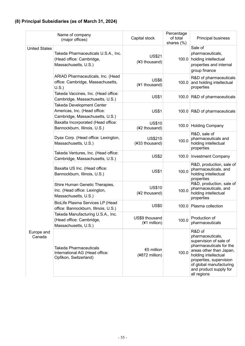 - 55 - (8) Principal Subsidiaries (as of March 31, 2024) Name of company (major offices) Capital stock Percentage of total shares (%) Principal business United States Takeda Pharmaceuticals U.S.A., Inc. (Head office: Cambridge, Massachusetts, U.S.) US$21 (¥3 thousand) 100.0 Sale of pharmaceuticals, holding intellectual properties and internal group finance ARIAD Pharmaceuticals, Inc. (Head office: Cambridge, Massachusetts, U.S.) US$6 (¥1 thousand) 100.0 R&D of pharmaceuticals and holding intellectual properties Takeda Vaccines, Inc. (Head office: Cambridge, Massachusetts, U.S.) US$1 100.0 R&D of pharmaceuticals Takeda Development Center Americas, Inc. (Head office: Cambridge, Massachusetts, U.S.) US$1 100.0 R&D of pharmaceuticals Baxalta Incorporated (Head office: Bannockburn, Illinois, U.S.) US$10 (¥2 thousand) 100.0 Holding Company Dyax Corp. (Head office: Lexington, Massachusetts, U.S.) US$215 (¥33 thousand) 100.0 R&D, sale of pharmaceuticals and holding intellectual properties Takeda Ventures, Inc. (Head office: Cambridge, Massachusetts, U.S.) US$2 100.0 Investment Company Baxalta US Inc. (Head office: Bannockburn, Illinois, U.S.) US$1 100.0 R&D, production, sale of pharmaceuticals, and holding intellectual properties Shire Human Genetic Therapies, Inc. (Head office: Lexington, Massachusetts, U.S.) US$10 (¥2 thousand) 100.0 R&D, production, sale of pharmaceuticals, and holding intellectual properties BioLife Plasma Services LP (Head office: Bannockburn, Illinois, U.S.) US$0 100.0 Plasma collection Takeda Manufacturing U.S.A., Inc. (Head office: Cambridge, Massachusetts, U.S.) US$9 thousand (¥1 million) 100.0 Production of pharmaceuticals Europe and Canada Takeda Pharmaceuticals International AG (Head office: Opfikon, Switzerland) €5 million (¥872 million) 100.0 R&D of pharmaceuticals, supervision of sale of pharmaceuticals for the areas other than Japan, holding intellectual properties, supervision of global manufacturing and product supply for all regions