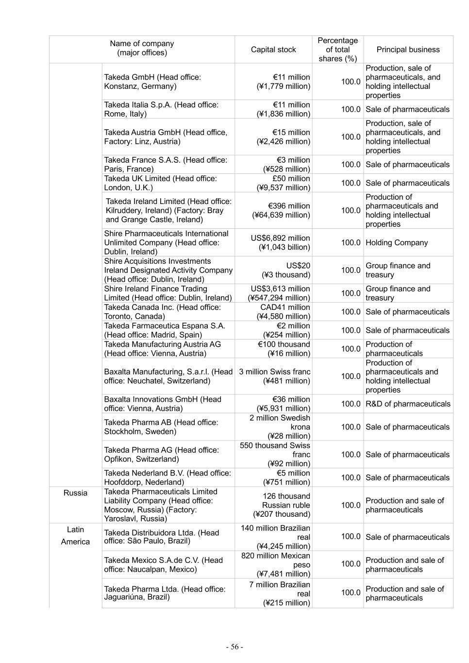 - 56 - Name of company (major offices) Capital stock Percentage of total shares (%) Principal business Takeda GmbH (Head office: Konstanz, Germany) €11 million (¥1,779 million) 100.0 Production, sale of pharmaceuticals, and holding intellectual properties Takeda Italia S.p.A. (Head office: Rome, Italy) €11 million (¥1,836 million) 100.0 Sale of pharmaceuticals Takeda Austria GmbH (Head office, Factory: Linz, Austria) €15 million (¥2,426 million) 100.0 Production, sale of pharmaceuticals, and holding intellectual properties Takeda France S.A.S. (Head office: Paris, France) €3 million (¥528 million) 100.0 Sale of pharmaceuticals Takeda UK Limited (Head office: London, U.K.) £50 million (¥9,537 million) 100.0 Sale of pharmaceuticals Takeda Ireland Limited (Head office: Kilruddery, Ireland) (Factory: Bray and Grange Castle, Ireland) €396 million (¥64,639 million) 100.0 Production of pharmaceuticals and holding intellectual properties Shire Pharmaceuticals International Unlimited Company (Head office: Dublin, Ireland) US$6,892 million (¥1,043 billion) 100.0 Holding Company Shire Acquisitions Investments Ireland Designated Activity Company (Head office: Dublin, Ireland) US$20 (¥3 thousand) 100.0 Group finance and treasury Shire Ireland Finance Trading Limited (Head office: Dublin, Ireland) US$3,613 million (¥547,294 million) 100.0 Group finance and treasury Takeda Canada Inc. (Head office: Toronto, Canada) CAD41 million (¥4,580 million) 100.0 Sale of pharmaceuticals Takeda Farmaceutica Espana S.A. (Head office: Madrid, Spain) €2 million (¥254 million) 100.0 Sale of pharmaceuticals Takeda Manufacturing Austria AG (Head office: Vienna, Austria) €100 thousand (¥16 million) 100.0 Production of pharmaceuticals Baxalta Manufacturing, S.a.r.l. (Head office: Neuchatel, Switzerland) 3 million Swiss franc (¥481 million) 100.0 Production of pharmaceuticals and holding intellectual properties Baxalta Innovations GmbH (Head office: Vienna, Austria) €36 million (¥5,931 million) 100.0 R&D of pharmaceuticals Takeda Pharma AB (Head office: Stockholm, Sweden) 2 million Swedish krona (¥28 million) 100.0 Sale of pharmaceuticals Takeda Pharma AG (Head office: Opfikon, Switzerland) 550 thousand Swiss franc (¥92 million) 100.0 Sale of pharmaceuticals Takeda Nederland B.V. (Head office: Hoofddorp, Nederland) €5 million (¥751 million) 100.0 Sale of pharmaceuticals Russia Takeda Pharmaceuticals Limited Liability Company (Head office: Moscow, Russia) (Factory: Yaroslavl, Russia) 126 thousand Russian ruble (¥207 thousand) 100.0 Production and sale of pharmaceuticals Latin America Takeda Distribuidora Ltda. (Head office: São Paulo, Brazil) 140 million Brazilian real (¥4,245 million) 100.0 Sale of pharmaceuticals Takeda Mexico S.A.de C.V. (Head office: Naucalpan, Mexico) 820 million Mexican peso (¥7,481 million) 100.0 Production and sale of pharmaceuticals Takeda Pharma Ltda. (Head office: Jaguariúna, Brazil) 7 million Brazilian real (¥215 million) 100.0 Production and sale of pharmaceuticals