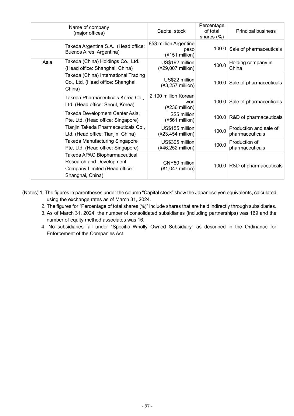 - 57 - Name of company (major offices) Capital stock Percentage of total shares (%) Principal business Takeda Argentina S.A. (Head office: Buenos Aires, Argentina) 853 million Argentine peso (¥151 million) 100.0 Sale of pharmaceuticals Asia Takeda (China) Holdings Co., Ltd. (Head office: Shanghai, China) US$192 million (¥29,007 million) 100.0 Holding company in China Takeda (China) International Trading Co., Ltd. (Head office: Shanghai, China) US$22 million (¥3,257 million) 100.0 Sale of pharmaceuticals Takeda Pharmaceuticals Korea Co., Ltd. (Head office: Seoul, Korea) 2,100 million Korean won (¥236 million) 100.0 Sale of pharmaceuticals Takeda Development Center Asia, Pte. Ltd. (Head office: Singapore) S$5 million (¥561 million) 100.0 R&D of pharmaceuticals Tianjin Takeda Pharmaceuticals Co., Ltd. (Head office: Tianjin, China) US$155 million (¥23,454 million) 100.0 Production and sale of pharmaceuticals Takeda Manufacturing Singapore Pte. Ltd. (Head office: Singapore) US$305 million (¥46,252 million) 100.0 Production of pharmaceuticals Takeda APAC Biopharmaceutical Research and Development Company Limited (Head office : Shanghai, China) CNY50 million (¥1,047 million) 100.0 R&D of pharmaceuticals (Notes) 1. The figures in parentheses under the column “Capital stock” show the Japanese yen equivalents, calculated using the exchange rates as of March 31, 2024. 2. The figures for “Percentage of total shares (%)” include shares that are held indirectly through subsidiaries. 3. As of March 31, 2024, the number of consolidated subsidiaries (including partnerships) was 169 and the number of equity method associates was 16. 4. No subsidiaries fall under "Specific Wholly Owned Subsidiary" as described in the Ordinance for Enforcement of the Companies Act.