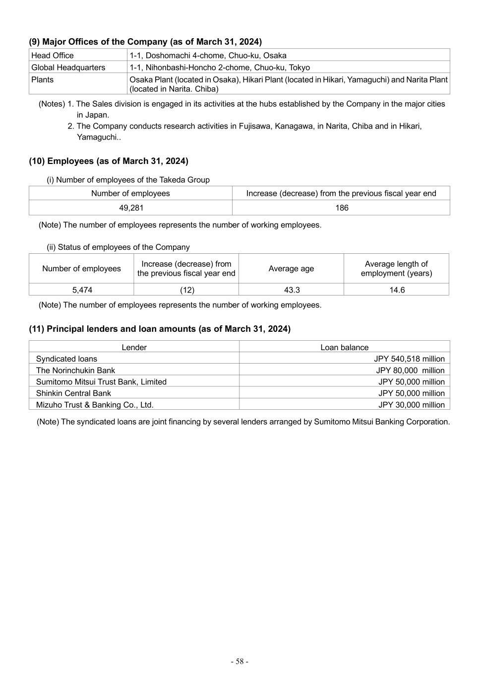 - 58 - (9) Major Offices of the Company (as of March 31, 2024) Head Office 1-1, Doshomachi 4-chome, Chuo-ku, Osaka Global Headquarters 1-1, Nihonbashi-Honcho 2-chome, Chuo-ku, Tokyo Plants Osaka Plant (located in Osaka), Hikari Plant (located in Hikari, Yamaguchi) and Narita Plant (located in Narita. Chiba) (Notes) 1. The Sales division is engaged in its activities at the hubs established by the Company in the major cities in Japan. 2. The Company conducts research activities in Fujisawa, Kanagawa, in Narita, Chiba and in Hikari, Yamaguchi.. (10) Employees (as of March 31, 2024) (i) Number of employees of the Takeda Group Number of employees Increase (decrease) from the previous fiscal year end 49,281 186 (Note) The number of employees represents the number of working employees. (ii) Status of employees of the Company Number of employees Increase (decrease) from the previous fiscal year end Average age Average length of employment (years) 5,474 (12) 43.3 14.6 (Note) The number of employees represents the number of working employees. (11) Principal lenders and loan amounts (as of March 31, 2024) Lender Loan balance Syndicated loans JPY 540,518 million The Norinchukin Bank JPY 80,000 million Sumitomo Mitsui Trust Bank, Limited JPY 50,000 million Shinkin Central Bank JPY 50,000 million Mizuho Trust & Banking Co., Ltd. JPY 30,000 million (Note) The syndicated loans are joint financing by several lenders arranged by Sumitomo Mitsui Banking Corporation.