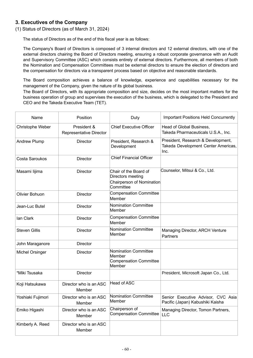 - 60 - 3. Executives of the Company (1) Status of Directors (as of March 31, 2024) The status of Directors as of the end of this fiscal year is as follows: The Company's Board of Directors is composed of 3 internal directors and 12 external directors, with one of the external directors chairing the Board of Directors meeting, ensuring a robust corporate governance with an Audit and Supervisory Committee (ASC) which consists entirely of external directors. Furthermore, all members of both the Nomination and Compensation Committees must be external directors to ensure the election of directors and the compensation for directors via a transparent process based on objective and reasonable standards. The Board composition achieves a balance of knowledge, experience and capabilities necessary for the management of the Company, given the nature of its global business. The Board of Directors, with its appropriate composition and size, decides on the most important matters for the business operation of group and supervises the execution of the business, which is delegated to the President and CEO and the Takeda Executive Team (TET). Name Position Duty Important Positions Held Concurrently Christophe Weber President & Representative Director Chief Executive Officer Head of Global Business, Takeda Pharmaceuticals U.S.A., Inc. Andrew Plump Director President, Research & Development President, Research & Development, Takeda Development Center Americas, Inc. Costa Saroukos Director Chief Financial Officer Masami Iijima Director Chair of the Board of Directors meeting Chairperson of Nomination Committee Counselor, Mitsui & Co., Ltd. Olivier Bohuon Director Compensation Committee Member Jean-Luc Butel Director Nomination Committee Member Ian Clark Director Compensation Committee Member Steven Gillis Director Nomination Committee Member Managing Director, ARCH Venture Partners John Maraganore Director Michel Orsinger Director Nomination Committee Member Compensation Committee Member *Miki Tsusaka Director President, Microsoft Japan Co., Ltd. Koji Hatsukawa Director who is an ASC Member Head of ASC Yoshiaki Fujimori Director who is an ASC Member Nomination Committee Member Senior Executive Advisor, CVC Asia Pacific (Japan) Kabushiki Kaisha Emiko Higashi Director who is an ASC Member Chairperson of Compensation Committee Managing Director, Tomon Partners, LLC Kimberly A. Reed Director who is an ASC Member