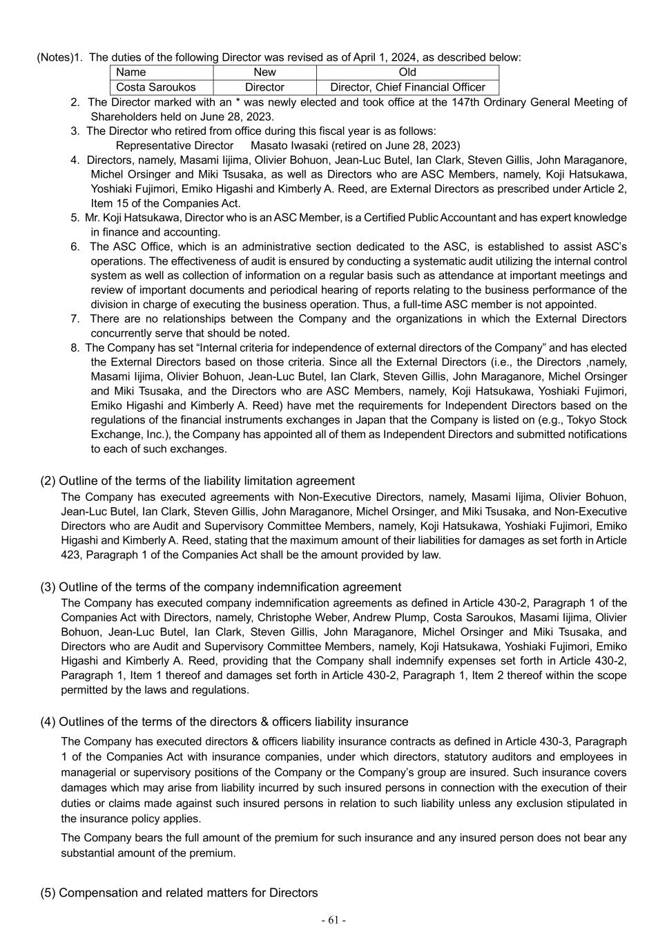 - 61 - (Notes)1. The duties of the following Director was revised as of April 1, 2024, as described below: Name New Old Costa Saroukos Director Director, Chief Financial Officer 2. The Director marked with an * was newly elected and took office at the 147th Ordinary General Meeting of Shareholders held on June 28, 2023. 3. The Director who retired from office during this fiscal year is as follows: Representative Director Masato Iwasaki (retired on June 28, 2023) 4. Directors, namely, Masami Iijima, Olivier Bohuon, Jean-Luc Butel, Ian Clark, Steven Gillis, John Maraganore, Michel Orsinger and Miki Tsusaka, as well as Directors who are ASC Members, namely, Koji Hatsukawa, Yoshiaki Fujimori, Emiko Higashi and Kimberly A. Reed, are External Directors as prescribed under Article 2, Item 15 of the Companies Act. 5. Mr. Koji Hatsukawa, Director who is an ASC Member, is a Certified Public Accountant and has expert knowledge in finance and accounting. 6. The ASC Office, which is an administrative section dedicated to the ASC, is established to assist ASC’s operations. The effectiveness of audit is ensured by conducting a systematic audit utilizing the internal control system as well as collection of information on a regular basis such as attendance at important meetings and review of important documents and periodical hearing of reports relating to the business performance of the division in charge of executing the business operation. Thus, a full-time ASC member is not appointed. 7. There are no relationships between the Company and the organizations in which the External Directors concurrently serve that should be noted. 8. The Company has set “Internal criteria for independence of external directors of the Company” and has elected the External Directors based on those criteria. Since all the External Directors (i.e., the Directors ,namely, Masami Iijima, Olivier Bohuon, Jean-Luc Butel, Ian Clark, Steven Gillis, John Maraganore, Michel Orsinger and Miki Tsusaka, and the Directors who are ASC Members, namely, Koji Hatsukawa, Yoshiaki Fujimori, Emiko Higashi and Kimberly A. Reed) have met the requirements for Independent Directors based on the regulations of the financial instruments exchanges in Japan that the Company is listed on (e.g., Tokyo Stock Exchange, Inc.), the Company has appointed all of them as Independent Directors and submitted notifications to each of such exchanges. (2) Outline of the terms of the liability limitation agreement The Company has executed agreements with Non-Executive Directors, namely, Masami Iijima, Olivier Bohuon, Jean-Luc Butel, Ian Clark, Steven Gillis, John Maraganore, Michel Orsinger, and Miki Tsusaka, and Non-Executive Directors who are Audit and Supervisory Committee Members, namely, Koji Hatsukawa, Yoshiaki Fujimori, Emiko Higashi and Kimberly A. Reed, stating that the maximum amount of their liabilities for damages as set forth in Article 423, Paragraph 1 of the Companies Act shall be the amount provided by law. (3) Outline of the terms of the company indemnification agreement The Company has executed company indemnification agreements as defined in Article 430-2, Paragraph 1 of the Companies Act with Directors, namely, Christophe Weber, Andrew Plump, Costa Saroukos, Masami Iijima, Olivier Bohuon, Jean-Luc Butel, Ian Clark, Steven Gillis, John Maraganore, Michel Orsinger and Miki Tsusaka, and Directors who are Audit and Supervisory Committee Members, namely, Koji Hatsukawa, Yoshiaki Fujimori, Emiko Higashi and Kimberly A. Reed, providing that the Company shall indemnify expenses set forth in Article 430-2, Paragraph 1, Item 1 thereof and damages set forth in Article 430-2, Paragraph 1, Item 2 thereof within the scope permitted by the laws and regulations. (4) Outlines of the terms of the directors & officers liability insurance The Company has executed directors & officers liability insurance contracts as defined in Article 430-3, Paragraph 1 of the Companies Act with insurance companies, under which directors, statutory auditors and employees in managerial or supervisory positions of the Company or the Company’s group are insured. Such insurance covers damages which may arise from liability incurred by such insured persons in connection with the execution of their duties or claims made against such insured persons in relation to such liability unless any exclusion stipulated in the insurance policy applies. The Company bears the full amount of the premium for such insurance and any insured person does not bear any substantial amount of the premium. (5) Compensation and related matters for Directors