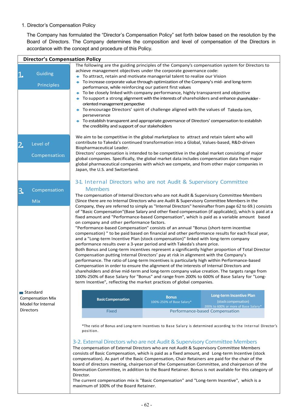 - 62 - 1. Director’s Compensation Policy The Company has formulated the “Director’s Compensation Policy” set forth below based on the resolution by the Board of Directors. The Company determines the composition and level of compensation of the Directors in accordance with the concept and procedure of this Policy. Director’s Compensation Policy ■ Standard Compensation Mix Model for Internal Directors The following are the guiding principles of the Company's compensation system for Directors to achieve management objectives under the corporate governance code: ◆ To attract, retain and motivate managerial talent to realize our Vision ◆ To increase corporate value through optimization of the Company’s mid- and long-term performance, while reinforcing our patient first values ◆ To be closely linked with company performance, highly transparent and objective ◆ To support a strong alignment with the interests of shareholders and enhance shareholder - oriented management perspective ◆ To encourage Directors’ spirit of challenge aligned with the values of Takeda-ism, perseverance ◆ To establish transparent and appropriate governance of Directors' compensation to establish the credibility and support of our stakeholders We aim to be competitive in the global marketplace to attract and retain talent who will contribute to Takeda’s continued transformation into a Global, Values-based, R&D-driven Biopharmaceutical Leader. Directors' compensation is intended to be competitive in the global market consisting of major global companies. Specifically, the global market data includes compensation data from major global pharmaceutical companies with which we compete, and from other major companies in Japan, the U.S. and Switzerland. 3-1. Internal Directors who are not Audit & Supervisory Committee Members The compensation of Internal Directors who are not Audit & Supervisory Committee Members (Since there are no Internal Directors who are Audit & Supervisory Committee Members in the Company, they are referred to simply as "Internal Directors" hereinafter from page 62 to 69.) consists of "Basic Compensation"(Base Salary and other fixed compensation (if applicable)), which is paid at a fixed amount and "Performance-based Compensation", which is paid as a variable amount based on company and other performance factors. "Performance-based Compensation" consists of an annual "Bonus (short-term incentive compensation) " to be paid based on financial and other performance results for each fiscal year, and a "Long-term Incentive Plan (stock compensation)" linked with long-term company performance results over a 3-year period and with Takeda's share price. Both Bonus and Long-term incentives represent a significantly higher proportion of Total Director Compensation putting Internal Directors’ pay at risk in alignment with the Company’s performance. The ratio of Long-term Incentives is particularly high within Performance-based Compensation in order to ensure the alignment of the interests of Internal Directors and shareholders and drive mid-term and long-term company value creation. The targets range from 100%-250% of Base Salary for "Bonus" and range from 200% to 600% of Base Salary for "Long- term Incentive", reflecting the market practices of global companies. Fixed Performance-based Compensation *The ratio of Bonus and Long-term Incentives to Base Salary is determined according to the Internal Director’s posi tion. 3-2. External Directors who are not Audit & Supervisory Committee Members The compensation of External Directors who are not Audit & Supervisory Committee Members consists of Basic Compensation, which is paid as a fixed amount, and Long-term Incentive (stock compensation). As part of the Basic Compensation, Chair Retainers are paid for the chair of the board of directors meeting, chairperson of the Compensation Committee, and chairperson of the Nomination Committee, in addition to the Board Retainer. Bonus is not available for this category of Director. The current compensation mix is "Basic Compensation" and "Long-term Incentive", which is a maximum of 100% of the Board Retainer. 1. Guiding Principles 2. Level of Compensation 3. Compensation Mix Bonus 100%-250% of Base Salary* Basic Compensation Long-term Incentive Plan (stock compensation) 200% to 600% or more of Base Salary*