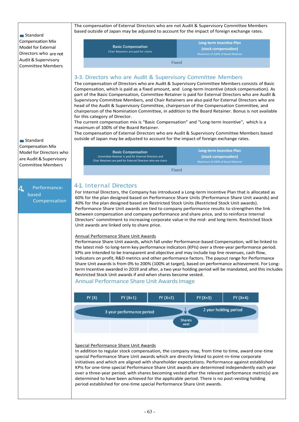 - 63 - ■ Standard Compensation Mix Model for External Directors who are not Audit & Supervisory Committee Members ■ Standard Compensation Mix Model for Directors who are Audit & Supervisory Committee Members The compensation of External Directors who are not Audit & Supervisory Committee Members based outside of Japan may be adjusted to account for the impact of foreign exchange rates. Fixed 3-3. Directors who are Audit & Supervisory Committee Members The compensation of Directors who are Audit & Supervisory Committee Members consists of Basic Compensation, which is paid as a fixed amount, and Long-term Incentive (stock compensation). As part of the Basic Compensation, Committee Retainer is paid for External Directors who are Audit & Supervisory Committee Members, and Chair Retainers are also paid for External Directors who are head of the Audit & Supervisory Committee, chairperson of the Compensation Committee, and chairperson of the Nomination Committee, in addition to the Board Retainer. Bonus is not available for this category of Director. The current compensation mix is "Basic Compensation" and "Long-term Incentive", which is a maximum of 100% of the Board Retainer. The compensation of External Directors who are Audit & Supervisory Committee Members based outside of Japan may be adjusted to account for the impact of foreign exchange rates. Fixed 4-1. Internal Directors For Internal Directors, the Company has introduced a Long-term Incentive Plan that is allocated as 60% for the plan designed based on Performance Share Units (Performance Share Unit awards) and 40% for the plan designed based on Restricted Stock Units (Restricted Stock Unit awards). Performance Share Unit awards are tied to company performance results to strengthen the link between compensation and company performance and share price, and to reinforce Internal Directors’ commitment to increasing corporate value in the mid- and long-term. Restricted Stock Unit awards are linked only to share price. Annual Performance Share Unit Awards Performance Share Unit awards, which fall under Performance-based Compensation, will be linked to the latest mid- to long-term key performance indicators (KPIs) over a three-year performance period. KPIs are intended to be transparent and objective and may include top line revenues, cash flow, indicators on profit, R&D metrics and other performance factors. The payout range for Performance Share Unit awards is from 0% to 200% (100% at target), based on performance achievement. For Long- term Incentive awarded in 2019 and after, a two year holding period will be mandated, and this includes Restricted Stock Unit awards if and when shares become vested. Annual Performance Share Unit Awards Image Special Performance Share Unit Awards In addition to regular stock compensation, the company may, from time to time, award one-time special Performance Share Unit awards which are directly linked to point-in-time corporate initiatives and which are aligned with shareholder expectations. Performance against established KPIs for one-time special Performance Share Unit awards are determined independently each year over a three-year period, with shares becoming vested after the relevant performance metric(s) are determined to have been achieved for the applicable period. There is no post-vesting holding period established for one-time special Performance Share Unit awards. 4. Performance- based Compensation Basic Compensation Chair Retainers are paid for chairs Long-term Incentive Plan (stock compensation) Maximum of 100% of Board Retainer Basic Compensation Committee Retainer is paid for External Directors and Chair Retainers are paid for External Directors who are chairs Long-term Incentive Plan (stock compensation) Maximum of 100% of Board Retainer