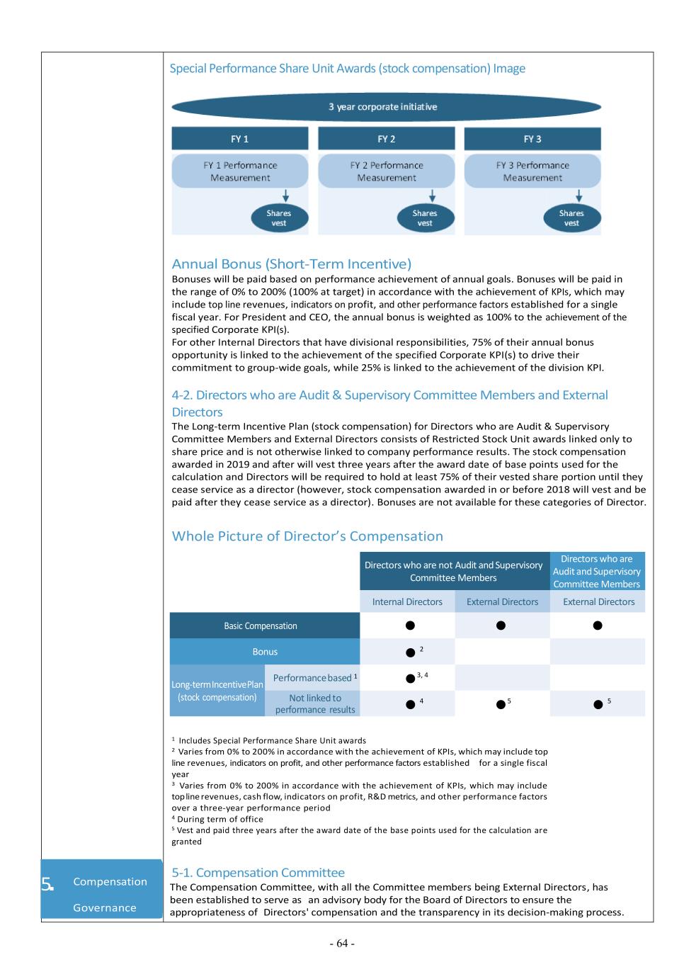 - 64 - Special Performance Share Unit Awards (stock compensation) Image Annual Bonus (Short-Term Incentive) Bonuses will be paid based on performance achievement of annual goals. Bonuses will be paid in the range of 0% to 200% (100% at target) in accordance with the achievement of KPIs, which may include top line revenues, indicators on profit, and other performance factors established for a single fiscal year. For President and CEO, the annual bonus is weighted as 100% to the achievement of the specified Corporate KPI(s). For other Internal Directors that have divisional responsibilities, 75% of their annual bonus opportunity is linked to the achievement of the specified Corporate KPI(s) to drive their commitment to group-wide goals, while 25% is linked to the achievement of the division KPI. 4-2. Directors who are Audit & Supervisory Committee Members and External Directors The Long-term Incentive Plan (stock compensation) for Directors who are Audit & Supervisory Committee Members and External Directors consists of Restricted Stock Unit awards linked only to share price and is not otherwise linked to company performance results. The stock compensation awarded in 2019 and after will vest three years after the award date of base points used for the calculation and Directors will be required to hold at least 75% of their vested share portion until they cease service as a director (however, stock compensation awarded in or before 2018 will vest and be paid after they cease service as a director). Bonuses are not available for these categories of Director. Whole Picture of Director’s Compensation Directors who are not Audit and Supervisory Committee Members Directors who are Audit and Supervisory Committee Members Internal Directors External Directors External Directors Basic Compensation    Bonus 2 Long-term Incentive Plan (stock compensation) Performance based 1  3, 4 Not linked to performance results 4  5 5 1 Includes Special Performance Share Unit awards 2 Varies from 0% to 200% in accordance with the achievement of KPIs, which may include top line revenues, indicators on profit, and other performance factors established for a single fiscal year 3 Varies from 0% to 200% in accordance with the achievement of KPIs, which may include top line revenues, cash flow, indicators on profit, R&D metrics, and other performance factors over a three-year performance period 4 During term of office 5 Vest and paid three years after the award date of the base points used for the calculation are granted 5-1. Compensation Committee The Compensation Committee, with all the Committee members being External Directors, has been established to serve as an advisory body for the Board of Directors to ensure the appropriateness of Directors' compensation and the transparency in its decision-making process. 5. Compensation Governance