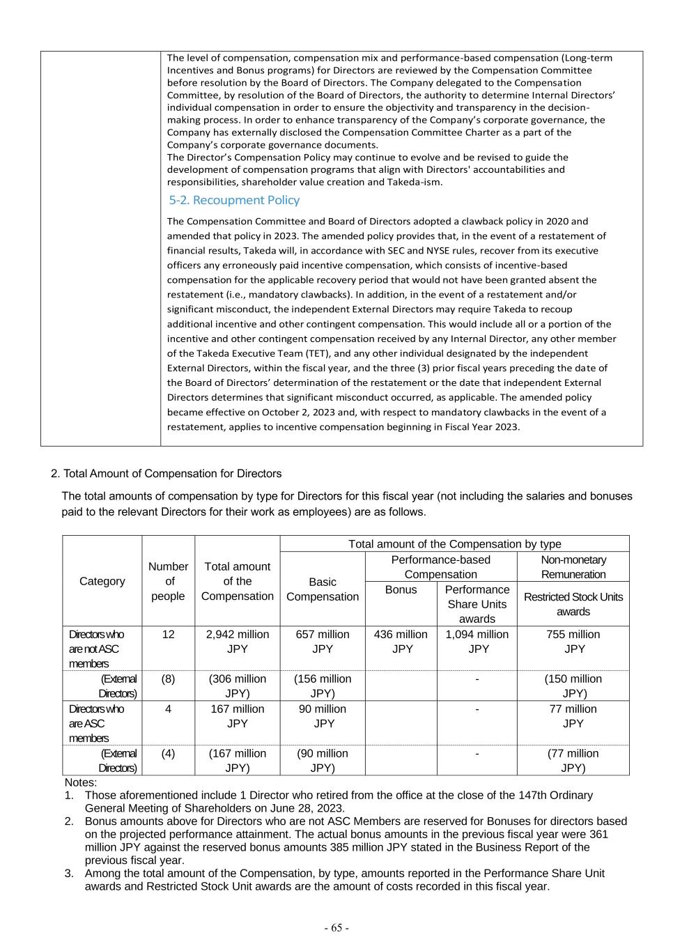 - 65 - The level of compensation, compensation mix and performance-based compensation (Long-term Incentives and Bonus programs) for Directors are reviewed by the Compensation Committee before resolution by the Board of Directors. The Company delegated to the Compensation Committee, by resolution of the Board of Directors, the authority to determine Internal Directors’ individual compensation in order to ensure the objectivity and transparency in the decision- making process. In order to enhance transparency of the Company’s corporate governance, the Company has externally disclosed the Compensation Committee Charter as a part of the Company’s corporate governance documents. The Director’s Compensation Policy may continue to evolve and be revised to guide the development of compensation programs that align with Directors' accountabilities and responsibilities, shareholder value creation and Takeda-ism. 5-2. Recoupment Policy The Compensation Committee and Board of Directors adopted a clawback policy in 2020 and amended that policy in 2023. The amended policy provides that, in the event of a restatement of financial results, Takeda will, in accordance with SEC and NYSE rules, recover from its executive officers any erroneously paid incentive compensation, which consists of incentive-based compensation for the applicable recovery period that would not have been granted absent the restatement (i.e., mandatory clawbacks). In addition, in the event of a restatement and/or significant misconduct, the independent External Directors may require Takeda to recoup additional incentive and other contingent compensation. This would include all or a portion of the incentive and other contingent compensation received by any Internal Director, any other member of the Takeda Executive Team (TET), and any other individual designated by the independent External Directors, within the fiscal year, and the three (3) prior fiscal years preceding the date of the Board of Directors’ determination of the restatement or the date that independent External Directors determines that significant misconduct occurred, as applicable. The amended policy became effective on October 2, 2023 and, with respect to mandatory clawbacks in the event of a restatement, applies to incentive compensation beginning in Fiscal Year 2023. 2. Total Amount of Compensation for Directors The total amounts of compensation by type for Directors for this fiscal year (not including the salaries and bonuses paid to the relevant Directors for their work as employees) are as follows. Notes: 1. Those aforementioned include 1 Director who retired from the office at the close of the 147th Ordinary General Meeting of Shareholders on June 28, 2023. 2. Bonus amounts above for Directors who are not ASC Members are reserved for Bonuses for directors based on the projected performance attainment. The actual bonus amounts in the previous fiscal year were 361 million JPY against the reserved bonus amounts 385 million JPY stated in the Business Report of the previous fiscal year. 3. Among the total amount of the Compensation, by type, amounts reported in the Performance Share Unit awards and Restricted Stock Unit awards are the amount of costs recorded in this fiscal year. Category Number of people Total amount of the Compensation Total amount of the Compensation by type Basic Compensation Performance-based Compensation Non-monetary Remuneration Bonus Performance Share Units awards Restricted Stock Units awards Directors who are not ASC members 12 2,942 million JPY 657 million JPY 436 million JPY 1,094 million JPY 755 million JPY (External Directors) (8) (306 million JPY) (156 million JPY) - (150 million JPY) Directors who are ASC members 4 167 million JPY 90 million JPY - 77 million JPY (External Directors) (4) (167 million JPY) (90 million JPY) - (77 million JPY)