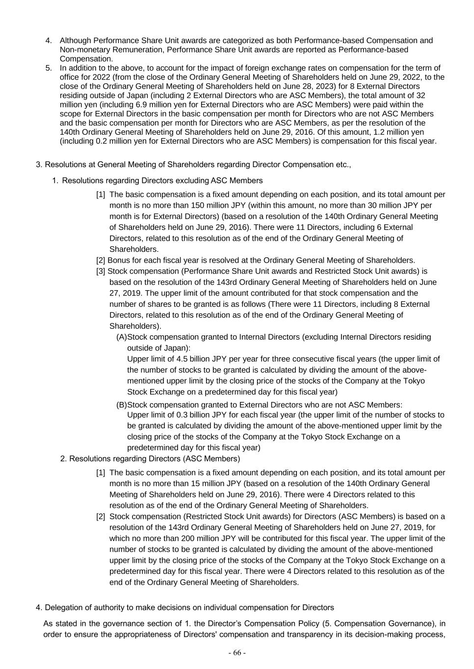 - 66 - 4. Although Performance Share Unit awards are categorized as both Performance-based Compensation and Non-monetary Remuneration, Performance Share Unit awards are reported as Performance-based Compensation. 5. In addition to the above, to account for the impact of foreign exchange rates on compensation for the term of office for 2022 (from the close of the Ordinary General Meeting of Shareholders held on June 29, 2022, to the close of the Ordinary General Meeting of Shareholders held on June 28, 2023) for 8 External Directors residing outside of Japan (including 2 External Directors who are ASC Members), the total amount of 32 million yen (including 6.9 million yen for External Directors who are ASC Members) were paid within the scope for External Directors in the basic compensation per month for Directors who are not ASC Members and the basic compensation per month for Directors who are ASC Members, as per the resolution of the 140th Ordinary General Meeting of Shareholders held on June 29, 2016. Of this amount, 1.2 million yen (including 0.2 million yen for External Directors who are ASC Members) is compensation for this fiscal year. 3. Resolutions at General Meeting of Shareholders regarding Director Compensation etc., 1. Resolutions regarding Directors excluding ASC Members [1] The basic compensation is a fixed amount depending on each position, and its total amount per month is no more than 150 million JPY (within this amount, no more than 30 million JPY per month is for External Directors) (based on a resolution of the 140th Ordinary General Meeting of Shareholders held on June 29, 2016). There were 11 Directors, including 6 External Directors, related to this resolution as of the end of the Ordinary General Meeting of Shareholders. [2] Bonus for each fiscal year is resolved at the Ordinary General Meeting of Shareholders. [3] Stock compensation (Performance Share Unit awards and Restricted Stock Unit awards) is based on the resolution of the 143rd Ordinary General Meeting of Shareholders held on June 27, 2019. The upper limit of the amount contributed for that stock compensation and the number of shares to be granted is as follows (There were 11 Directors, including 8 External Directors, related to this resolution as of the end of the Ordinary General Meeting of Shareholders). (A) Stock compensation granted to Internal Directors (excluding Internal Directors residing outside of Japan): Upper limit of 4.5 billion JPY per year for three consecutive fiscal years (the upper limit of the number of stocks to be granted is calculated by dividing the amount of the above- mentioned upper limit by the closing price of the stocks of the Company at the Tokyo Stock Exchange on a predetermined day for this fiscal year) (B) Stock compensation granted to External Directors who are not ASC Members: Upper limit of 0.3 billion JPY for each fiscal year (the upper limit of the number of stocks to be granted is calculated by dividing the amount of the above-mentioned upper limit by the closing price of the stocks of the Company at the Tokyo Stock Exchange on a predetermined day for this fiscal year) 2. Resolutions regarding Directors (ASC Members) [1] The basic compensation is a fixed amount depending on each position, and its total amount per month is no more than 15 million JPY (based on a resolution of the 140th Ordinary General Meeting of Shareholders held on June 29, 2016). There were 4 Directors related to this resolution as of the end of the Ordinary General Meeting of Shareholders. [2] Stock compensation (Restricted Stock Unit awards) for Directors (ASC Members) is based on a resolution of the 143rd Ordinary General Meeting of Shareholders held on June 27, 2019, for which no more than 200 million JPY will be contributed for this fiscal year. The upper limit of the number of stocks to be granted is calculated by dividing the amount of the above-mentioned upper limit by the closing price of the stocks of the Company at the Tokyo Stock Exchange on a predetermined day for this fiscal year. There were 4 Directors related to this resolution as of the end of the Ordinary General Meeting of Shareholders. 4. Delegation of authority to make decisions on individual compensation for Directors As stated in the governance section of 1. the Director’s Compensation Policy (5. Compensation Governance), in order to ensure the appropriateness of Directors' compensation and transparency in its decision-making process,