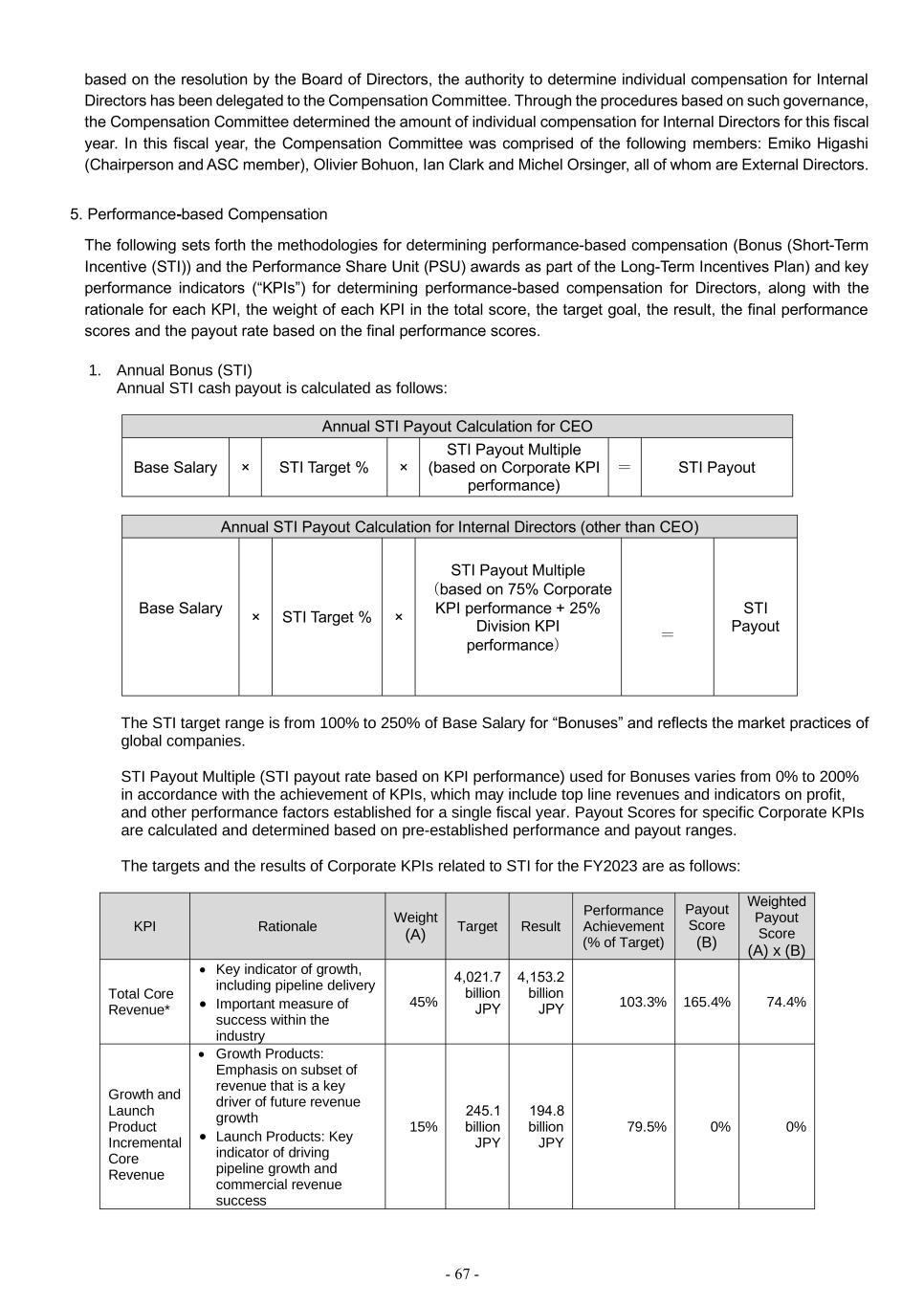 - 67 - based on the resolution by the Board of Directors, the authority to determine individual compensation for Internal Directors has been delegated to the Compensation Committee. Through the procedures based on such governance, the Compensation Committee determined the amount of individual compensation for Internal Directors for this fiscal year. In this fiscal year, the Compensation Committee was comprised of the following members: Emiko Higashi (Chairperson and ASC member), Olivier Bohuon, Ian Clark and Michel Orsinger, all of whom are External Directors. 5. Performance-based Compensation The following sets forth the methodologies for determining performance-based compensation (Bonus (Short-Term Incentive (STI)) and the Performance Share Unit (PSU) awards as part of the Long-Term Incentives Plan) and key performance indicators (“KPIs”) for determining performance-based compensation for Directors, along with the rationale for each KPI, the weight of each KPI in the total score, the target goal, the result, the final performance scores and the payout rate based on the final performance scores. 1. Annual Bonus (STI) Annual STI cash payout is calculated as follows: Annual STI Payout Calculation for CEO Base Salary × STI Target % × STI Payout Multiple (based on Corporate KPI performance) = STI Payout Annual STI Payout Calculation for Internal Directors (other than CEO) Base Salary × STI Target % × STI Payout Multiple (based on 75% Corporate KPI performance + 25% Division KPI performance) = STI Payout The STI target range is from 100% to 250% of Base Salary for “Bonuses” and reflects the market practices of global companies. STI Payout Multiple (STI payout rate based on KPI performance) used for Bonuses varies from 0% to 200% in accordance with the achievement of KPIs, which may include top line revenues and indicators on profit, and other performance factors established for a single fiscal year. Payout Scores for specific Corporate KPIs are calculated and determined based on pre-established performance and payout ranges. The targets and the results of Corporate KPIs related to STI for the FY2023 are as follows: KPI Rationale Weight (A) Target Result Performance Achievement (% of Target) Payout Score (B) Weighted Payout Score (A) x (B) Total Core Revenue* • Key indicator of growth, including pipeline delivery • Important measure of success within the industry 45% 4,021.7 billion JPY 4,153.2 billion JPY 103.3% 165.4% 74.4% Growth and Launch Product Incremental Core Revenue • Growth Products: Emphasis on subset of revenue that is a key driver of future revenue growth • Launch Products: Key indicator of driving pipeline growth and commercial revenue success 15% 245.1 billion JPY 194.8 billion JPY 79.5% 0% 0%