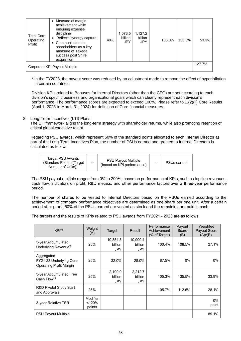 - 68 - Total Core Operating Profit • Measure of margin achievement while ensuring expense discipline • Reflects synergy capture • Communicated to shareholders as a key measure of Takeda success post Shire acquisition 40% 1,073.5 billion JPY 1,127.2 billion JPY 105.0% 133.3% 53.3% Corporate KPI Payout Multiple 127.7% * In the FY2023, the payout score was reduced by an adjustment made to remove the effect of hyperinflation in certain countries. Division KPIs related to Bonuses for Internal Directors (other than the CEO) are set according to each division’s specific business and organizational goals which can clearly represent each division’s performance. The performance scores are expected to exceed 100%. Please refer to 1.(2)(ii) Core Results (April 1, 2023 to March 31, 2024) for definition of Core financial measures. 2. Long-Term Incentives (LTI) Plans The LTI framework aligns the long-term strategy with shareholder returns, while also promoting retention of critical global executive talent. Regarding PSU awards, which represent 60% of the standard points allocated to each Internal Director as part of the Long-Term Incentives Plan, the number of PSUs earned and granted to Internal Directors is calculated as follows: Target PSU Awards (Standard Points ((Target Number of Units)) × PSU Payout Multiple (based on KPI performance) = PSUs earned The PSU payout multiple ranges from 0% to 200%, based on performance of KPIs, such as top line revenues, cash flow, indicators on profit, R&D metrics, and other performance factors over a three-year performance period. The number of shares to be vested to Internal Directors based on the PSUs earned according to the achievement of company performance objectives are determined as one share per one unit. After a certain period after grant, 50% of the PSUs earned are vested as stock and the remaining are paid in cash. The targets and the results of KPIs related to PSU awards from FY2021 - 2023 are as follows: KPI*1 Weight (A) Target Result Performance Achievement (% of Target) Payout Score (B) Weighted Payout Score (A)x(B) 3-year Accumulated Underlying Revenue*2 25% 10,854.3 billion JPY 10,900.4 billion JPY 100.4% 108.5% 27.1% Aggregated FY21-23 Underlying Core Operating Profit Margin 25% 32.0% 28.0% 87.5% 0% 0% 3-year Accumulated Free Cash Flow*3 25% 2,100.9 billion JPY 2,212.7 billion JPY 105.3% 135.5% 33.9% R&D Pivotal Study Start and Approvals 25% - - 105.7% 112.6% 28.1% 3-year Relative TSR Modifier +/-20% points 0% point PSU Payout Multiple 89.1%