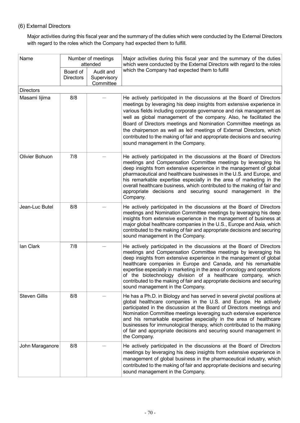 - 70 - (6) External Directors Major activities during this fiscal year and the summary of the duties which were conducted by the External Directors with regard to the roles which the Company had expected them to fulfill. Name Number of meetings attended Major activities during this fiscal year and the summary of the duties which were conducted by the External Directors with regard to the roles which the Company had expected them to fulfill Board of Directors Audit and Supervisory Committee Directors Masami Iijima 8/8 - He actively participated in the discussions at the Board of Directors meetings by leveraging his deep insights from extensive experience in various fields including corporate governance and risk management as well as global management of the company. Also, he facilitated the Board of Directors meetings and Nomination Committee meetings as the chairperson as well as led meetings of External Directors, which contributed to the making of fair and appropriate decisions and securing sound management in the Company. Olivier Bohuon 7/8 - He actively participated in the discussions at the Board of Directors meetings and Compensation Committee meetings by leveraging his deep insights from extensive experience in the management of global pharmaceutical and healthcare businesses in the U.S. and Europe, and his remarkable expertise especially in the area of marketing in the overall healthcare business, which contributed to the making of fair and appropriate decisions and securing sound management in the Company. Jean-Luc Butel 8/8 - He actively participated in the discussions at the Board of Directors meetings and Nomination Committee meetings by leveraging his deep insights from extensive experience in the management of business at major global healthcare companies in the U.S., Europe and Asia, which contributed to the making of fair and appropriate decisions and securing sound management in the Company. Ian Clark 7/8 - He actively participated in the discussions at the Board of Directors meetings and Compensation Committee meetings by leveraging his deep insights from extensive experience in the management of global healthcare companies in Europe and Canada, and his remarkable expertise especially in marketing in the area of oncology and operations of the biotechnology division of a healthcare company, which contributed to the making of fair and appropriate decisions and securing sound management in the Company. Steven Gillis 8/8 - He has a Ph.D. in Biology and has served in several pivotal positions at global healthcare companies in the U.S. and Europe. He actively participated in the discussion at the Board of Directors meetings and Nomination Committee meetings leveraging such extensive experience and his remarkable expertise especially in the area of healthcare businesses for immunological therapy, which contributed to the making of fair and appropriate decisions and securing sound management in the Company. John Maraganore 8/8 - He actively participated in the discussions at the Board of Directors meetings by leveraging his deep insights from extensive experience in management of global business in the pharmaceutical industry, which contributed to the making of fair and appropriate decisions and securing sound management in the Company.