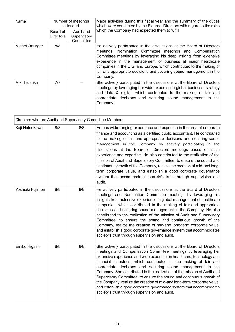 - 71 - Name Number of meetings attended Major activities during this fiscal year and the summary of the duties which were conducted by the External Directors with regard to the roles which the Company had expected them to fulfill Board of Directors Audit and Supervisory Committee Michel Orsinger 8/8 - He actively participated in the discussions at the Board of Directors meetings, Nomination Committee meetings and Compensation Committee meetings by leveraging his deep insights from extensive experience in the management of business at major healthcare companies in the U.S. and Europe, which contributed to the making of fair and appropriate decisions and securing sound management in the Company. Miki Tsusaka 7/7 - She actively participated in the discussions at the Board of Directors meetings by leveraging her wide expertise in global business, strategy and data & digital, which contributed to the making of fair and appropriate decisions and securing sound management in the Company. Directors who are Audit and Supervisory Committee Members Koji Hatsukawa 8/8 8/8 He has wide-ranging experience and expertise in the area of corporate finance and accounting as a certified public accountant. He contributed to the making of fair and appropriate decisions and securing sound management in the Company by actively participating in the discussions at the Board of Directors meetings based on such experience and expertise. He also contributed to the realization of the mission of Audit and Supervisory Committee: to ensure the sound and continuous growth of the Company, realize the creation of mid-and long- term corporate value, and establish a good corporate governance system that accommodates society’s trust through supervision and audit. Yoshiaki Fujimori 8/8 8/8 He actively participated in the discussions at the Board of Directors meetings and Nomination Committee meetings by leveraging his insights from extensive experience in global management of healthcare companies, which contributed to the making of fair and appropriate decisions and securing sound management in the Company. He also contributed to the realization of the mission of Audit and Supervisory Committee: to ensure the sound and continuous growth of the Company, realize the creation of mid-and long-term corporate value, and establish a good corporate governance system that accommodates society’s trust through supervision and audit. Emiko Higashi 8/8 8/8 She actively participated in the discussions at the Board of Directors meetings and Compensation Committee meetings by leveraging her extensive experience and wide expertise on healthcare, technology and financial industries, which contributed to the making of fair and appropriate decisions and securing sound management in the Company. She contributed to the realization of the mission of Audit and Supervisory Committee: to ensure the sound and continuous growth of the Company, realize the creation of mid-and long-term corporate value, and establish a good corporate governance system that accommodates society’s trust through supervision and audit.