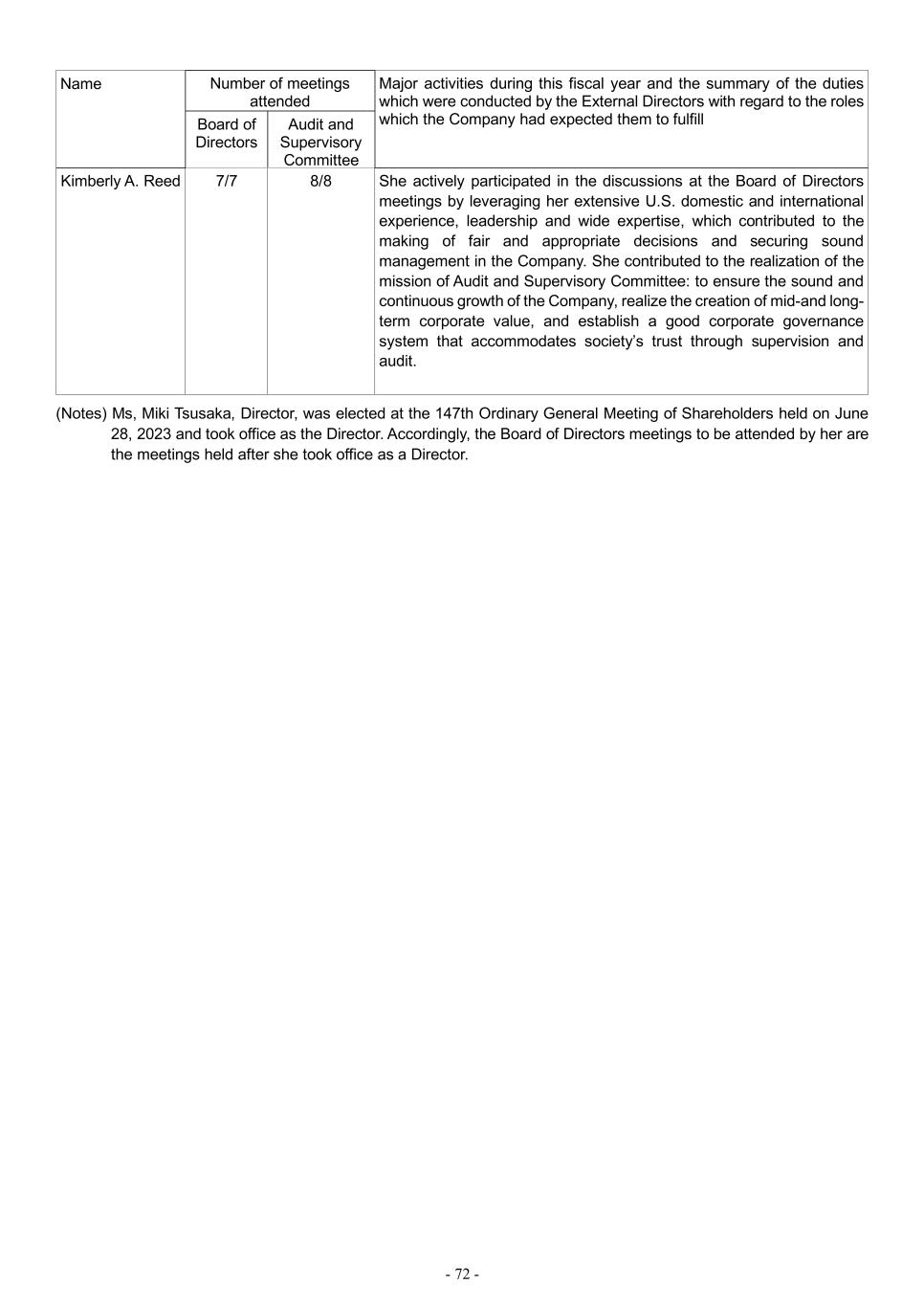 - 72 - Name Number of meetings attended Major activities during this fiscal year and the summary of the duties which were conducted by the External Directors with regard to the roles which the Company had expected them to fulfill Board of Directors Audit and Supervisory Committee Kimberly A. Reed 7/7 8/8 She actively participated in the discussions at the Board of Directors meetings by leveraging her extensive U.S. domestic and international experience, leadership and wide expertise, which contributed to the making of fair and appropriate decisions and securing sound management in the Company. She contributed to the realization of the mission of Audit and Supervisory Committee: to ensure the sound and continuous growth of the Company, realize the creation of mid-and long- term corporate value, and establish a good corporate governance system that accommodates society’s trust through supervision and audit. (Notes) Ms, Miki Tsusaka, Director, was elected at the 147th Ordinary General Meeting of Shareholders held on June 28, 2023 and took office as the Director. Accordingly, the Board of Directors meetings to be attended by her are the meetings held after she took office as a Director.