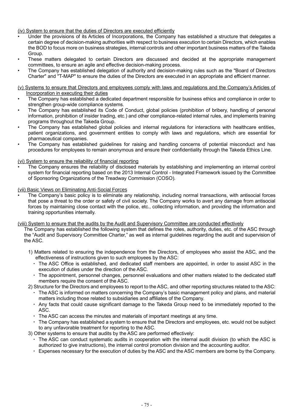 - 75 - (iv) System to ensure that the duties of Directors are executed efficiently • Under the provisions of its Articles of Incorporations, the Company has established a structure that delegates a certain degree of decision-making authorities with respect to business execution to certain Directors, which enables the BOD to focus more on business strategies, internal controls and other important business matters of the Takeda Group. • These matters delegated to certain Directors are discussed and decided at the appropriate management committees, to ensure an agile and effective decision-making process. • The Company has established delegation of authority and decision-making rules such as the "Board of Directors Charter" and "T-MAP" to ensure the duties of the Directors are executed in an appropriate and efficient manner. (v) Systems to ensure that Directors and employees comply with laws and regulations and the Company’s Articles of Incorporation in executing their duties • The Company has established a dedicated department responsible for business ethics and compliance in order to strengthen group-wide compliance systems. • The Company has established its Code of Conduct, global policies (prohibition of bribery, handling of personal information, prohibition of insider trading, etc.) and other compliance-related internal rules, and implements training programs throughout the Takeda Group. • The Company has established global policies and internal regulations for interactions with healthcare entities, patient organizations, and government entities to comply with laws and regulations, which are essential for pharmaceutical companies. • The Company has established guidelines for raising and handling concerns of potential misconduct and has procedures for employees to remain anonymous and ensure their confidentiality through the Takeda Ethics Line. (vi) System to ensure the reliability of financial reporting • The Company ensures the reliability of disclosed materials by establishing and implementing an internal control system for financial reporting based on the 2013 Internal Control - Integrated Framework issued by the Committee of Sponsoring Organizations of the Treadway Commission (COSO). (vii) Basic Views on Eliminating Anti-Social Forces • The Company’s basic policy is to eliminate any relationship, including normal transactions, with antisocial forces that pose a threat to the order or safety of civil society. The Company works to avert any damage from antisocial forces by maintaining close contact with the police, etc., collecting information, and providing the information and training opportunities internally. (viii) System to ensure that the audits by the Audit and Supervisory Committee are conducted effectively The Company has established the following system that defines the roles, authority, duties, etc. of the ASC through the “Audit and Supervisory Committee Charter,” as well as internal guidelines regarding the audit and supervision of the ASC. 1) Matters related to ensuring the independence from the Directors, of employees who assist the ASC, and the effectiveness of instructions given to such employees by the ASC: ・ The ASC Office is established, and dedicated staff members are appointed, in order to assist ASC in the execution of duties under the direction of the ASC. ・ The appointment, personnel changes, personnel evaluations and other matters related to the dedicated staff members require the consent of the ASC. 2) Structure for the Directors and employees to report to the ASC, and other reporting structures related to the ASC: ・ The ASC is informed on matters concerning the Company’s basic management policy and plans, and material matters including those related to subsidiaries and affiliates of the Company. ・ Any facts that could cause significant damage to the Takeda Group need to be immediately reported to the ASC. ・ The ASC can access the minutes and materials of important meetings at any time. ・ The Company has established a system to ensure that the Directors and employees, etc. would not be subject to any unfavorable treatment for reporting to the ASC. 3) Other systems to ensure that audits by the ASC are performed effectively: ・ The ASC can conduct systematic audits in cooperation with the internal audit division (to which the ASC is authorized to give instructions), the internal control promotion division and the accounting auditor. ・ Expenses necessary for the execution of duties by the ASC and the ASC members are borne by the Company.
