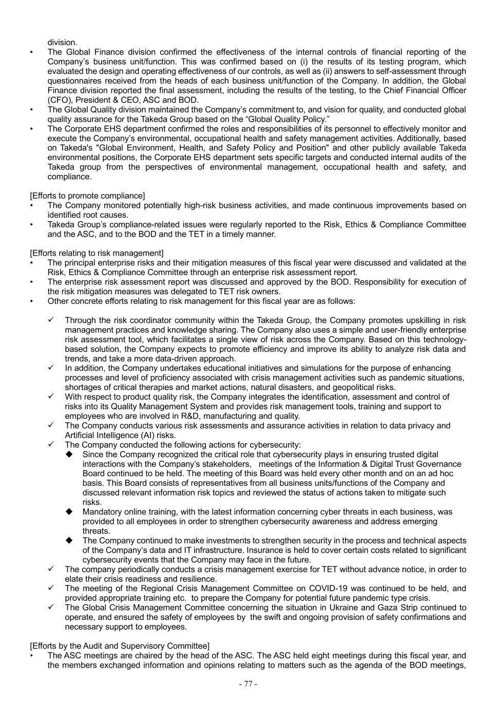 - 77 - division. • The Global Finance division confirmed the effectiveness of the internal controls of financial reporting of the Company’s business unit/function. This was confirmed based on (i) the results of its testing program, which evaluated the design and operating effectiveness of our controls, as well as (ii) answers to self-assessment through questionnaires received from the heads of each business unit/function of the Company. In addition, the Global Finance division reported the final assessment, including the results of the testing, to the Chief Financial Officer (CFO), President & CEO, ASC and BOD. • The Global Quality division maintained the Company’s commitment to, and vision for quality, and conducted global quality assurance for the Takeda Group based on the “Global Quality Policy.” • The Corporate EHS department confirmed the roles and responsibilities of its personnel to effectively monitor and execute the Company’s environmental, occupational health and safety management activities. Additionally, based on Takeda's "Global Environment, Health, and Safety Policy and Position" and other publicly available Takeda environmental positions, the Corporate EHS department sets specific targets and conducted internal audits of the Takeda group from the perspectives of environmental management, occupational health and safety, and compliance. [Efforts to promote compliance] • The Company monitored potentially high-risk business activities, and made continuous improvements based on identified root causes. • Takeda Group’s compliance-related issues were regularly reported to the Risk, Ethics & Compliance Committee and the ASC, and to the BOD and the TET in a timely manner. [Efforts relating to risk management] • The principal enterprise risks and their mitigation measures of this fiscal year were discussed and validated at the Risk, Ethics & Compliance Committee through an enterprise risk assessment report. • The enterprise risk assessment report was discussed and approved by the BOD. Responsibility for execution of the risk mitigation measures was delegated to TET risk owners. • Other concrete efforts relating to risk management for this fiscal year are as follows: ✓ Through the risk coordinator community within the Takeda Group, the Company promotes upskilling in risk management practices and knowledge sharing. The Company also uses a simple and user-friendly enterprise risk assessment tool, which facilitates a single view of risk across the Company. Based on this technology- based solution, the Company expects to promote efficiency and improve its ability to analyze risk data and trends, and take a more data-driven approach. ✓ In addition, the Company undertakes educational initiatives and simulations for the purpose of enhancing processes and level of proficiency associated with crisis management activities such as pandemic situations, shortages of critical therapies and market actions, natural disasters, and geopolitical risks. ✓ With respect to product quality risk, the Company integrates the identification, assessment and control of risks into its Quality Management System and provides risk management tools, training and support to employees who are involved in R&D, manufacturing and quality. ✓ The Company conducts various risk assessments and assurance activities in relation to data privacy and Artificial Intelligence (AI) risks. ✓ The Company conducted the following actions for cybersecurity: ◆ Since the Company recognized the critical role that cybersecurity plays in ensuring trusted digital interactions with the Company’s stakeholders, meetings of the Information & Digital Trust Governance Board continued to be held. The meeting of this Board was held every other month and on an ad hoc basis. This Board consists of representatives from all business units/functions of the Company and discussed relevant information risk topics and reviewed the status of actions taken to mitigate such risks. ◆ Mandatory online training, with the latest information concerning cyber threats in each business, was provided to all employees in order to strengthen cybersecurity awareness and address emerging threats. ◆ The Company continued to make investments to strengthen security in the process and technical aspects of the Company’s data and IT infrastructure. Insurance is held to cover certain costs related to significant cybersecurity events that the Company may face in the future. ✓ The company periodically conducts a crisis management exercise for TET without advance notice, in order to elate their crisis readiness and resilience. ✓ The meeting of the Regional Crisis Management Committee on COVID-19 was continued to be held, and provided appropriate training etc. to prepare the Company for potential future pandemic type crisis. ✓ The Global Crisis Management Committee concerning the situation in Ukraine and Gaza Strip continued to operate, and ensured the safety of employees by the swift and ongoing provision of safety confirmations and necessary support to employees. [Efforts by the Audit and Supervisory Committee] • The ASC meetings are chaired by the head of the ASC. The ASC held eight meetings during this fiscal year, and the members exchanged information and opinions relating to matters such as the agenda of the BOD meetings,