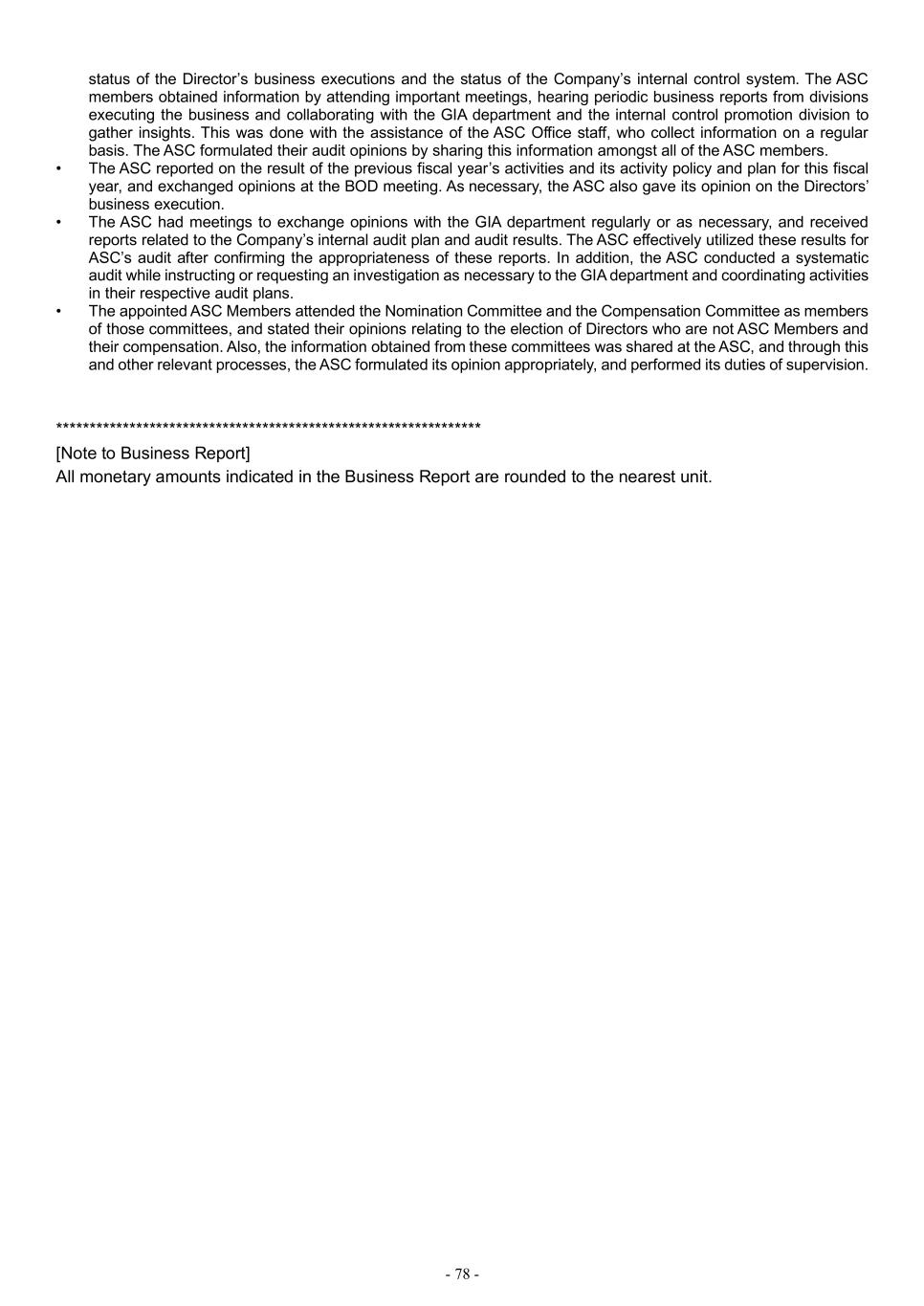 - 78 - status of the Director’s business executions and the status of the Company’s internal control system. The ASC members obtained information by attending important meetings, hearing periodic business reports from divisions executing the business and collaborating with the GIA department and the internal control promotion division to gather insights. This was done with the assistance of the ASC Office staff, who collect information on a regular basis. The ASC formulated their audit opinions by sharing this information amongst all of the ASC members. • The ASC reported on the result of the previous fiscal year’s activities and its activity policy and plan for this fiscal year, and exchanged opinions at the BOD meeting. As necessary, the ASC also gave its opinion on the Directors’ business execution. • The ASC had meetings to exchange opinions with the GIA department regularly or as necessary, and received reports related to the Company’s internal audit plan and audit results. The ASC effectively utilized these results for ASC’s audit after confirming the appropriateness of these reports. In addition, the ASC conducted a systematic audit while instructing or requesting an investigation as necessary to the GIA department and coordinating activities in their respective audit plans. • The appointed ASC Members attended the Nomination Committee and the Compensation Committee as members of those committees, and stated their opinions relating to the election of Directors who are not ASC Members and their compensation. Also, the information obtained from these committees was shared at the ASC, and through this and other relevant processes, the ASC formulated its opinion appropriately, and performed its duties of supervision. **************************************************************** [Note to Business Report] All monetary amounts indicated in the Business Report are rounded to the nearest unit.