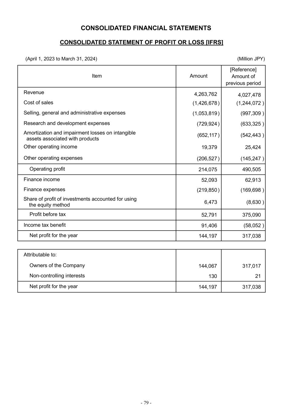 - 79 - CONSOLIDATED FINANCIAL STATEMENTS CONSOLIDATED STATEMENT OF PROFIT OR LOSS [IFRS] (April 1, 2023 to March 31, 2024) (Million JPY) Item Amount [Reference] Amount of previous period Revenue 4,263,762 4,027,478 Cost of sales (1,426,678 ) (1,244,072 ) Selling, general and administrative expenses (1,053,819 ) (997,309 ) Research and development expenses (729,924 ) (633,325 ) Amortization and impairment losses on intangible assets associated with products (652,117 ) (542,443 ) Other operating income 19,379 25,424 Other operating expenses (206,527 ) (145,247 ) Operating profit 214,075 490,505 Finance income 52,093 62,913 Finance expenses (219,850 ) (169,698 ) Share of profit of investments accounted for using the equity method 6,473 (8,630 ) Profit before tax 52,791 375,090 Income tax benefit 91,406 (58,052 ) Net profit for the year 144,197 317,038 Attributable to: 109,126 (112) Owners of the Company 144,067 317,017 Non-controlling interests 130 21 Net profit for the year 144,197 317,038