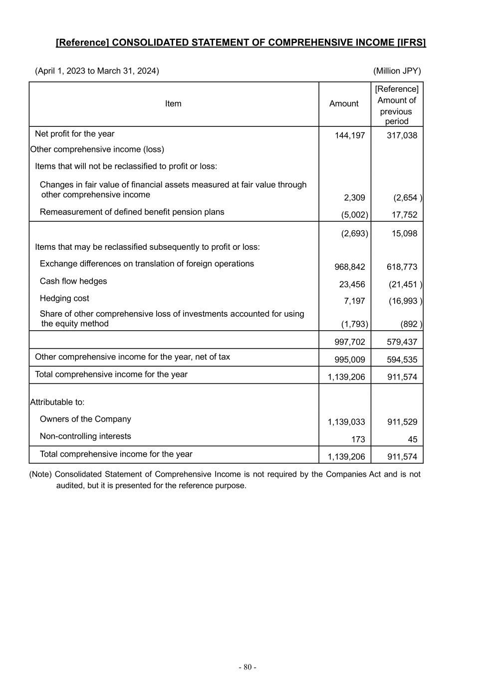 - 80 - [Reference] CONSOLIDATED STATEMENT OF COMPREHENSIVE INCOME [IFRS] (April 1, 2023 to March 31, 2024) (Million JPY) Item Amount [Reference] Amount of previous period Net profit for the year 144,197 317,038 Other comprehensive income (loss) Items that will not be reclassified to profit or loss: Changes in fair value of financial assets measured at fair value through other comprehensive income 2,309 (2,654 ) Remeasurement of defined benefit pension plans (5,002 ) 17,752 (2,693 ) 15,098 Items that may be reclassified subsequently to profit or loss: Exchange differences on translation of foreign operations 968,842 618,773 Cash flow hedges 23,456 (21,451 ) Hedging cost 7,197 (16,993 ) Share of other comprehensive loss of investments accounted for using the equity method (1,793 ) (892 ) 997,702 579,437 Other comprehensive income for the year, net of tax 995,009 594,535 Total comprehensive income for the year 1,139,206 911,574 Attributable to: Attributable to: Owners of the Company 1,139,033 911,529 Non-controlling interests 173 45 Total comprehensive income for the year 1,139,206 911,574 (Note) Consolidated Statement of Comprehensive Income is not required by the Companies Act and is not audited, but it is presented for the reference purpose.