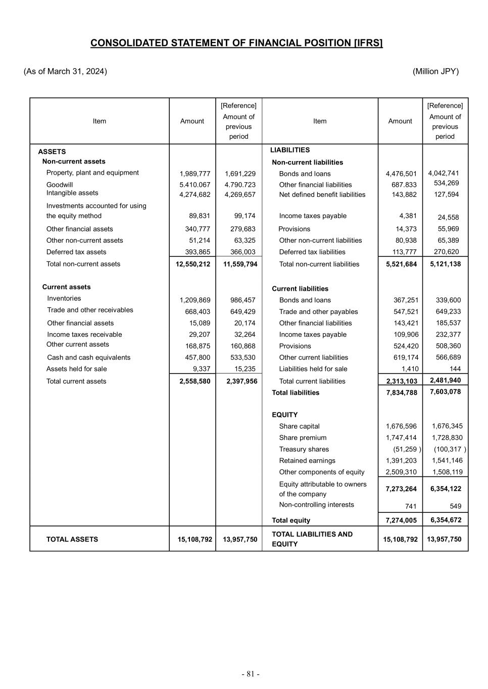 - 81 - CONSOLIDATED STATEMENT OF FINANCIAL POSITION [IFRS] (As of March 31, 2024) (Million JPY) Item Amount [Reference] Amount of previous period Item Amount [Reference] Amount of previous period ASSETS 1,316,531 LIABILITIES 4,766,005 Non-current assets Non-current liabilities Property, plant and equipment 1,989,777 1,691,229 Bonds and loans 4,476,501 4,042,741 Goodwill 5,410,067 4,790,723 Other financial liabilities 687,833 534,269 Intangible assets 4,274,682 4,269,657 Net defined benefit liabilities 143,882 127,594 Investments accounted for using the equity method 89,831 99,174 Income taxes payable 4,381 24,558 Other financial assets 340,777 279,683 Provisions 14,373 55,969 Other non-current assets 51,214 63,325 Other non-current liabilities 80,938 65,389 Deferred tax assets 393,865 366,003 Deferred tax liabilities 113,777 270,620 Total non-current assets 12,550,212 11,559,794 Total non-current liabilities 5,521,684 5,121,138 Current assets Current liabilities Inventories 1,209,869 986,457 Bonds and loans 367,251 339,600 Trade and other receivables 668,403 649,429 Trade and other payables 547,521 649,233 Other financial assets 15,089 20,174 Other financial liabilities 143,421 185,537 Income taxes receivable 29,207 32,264 Income taxes payable 109,906 232,377 Other current assets 168,875 160,868 Provisions 524,420 508,360 Cash and cash equivalents 457,800 533,530 Other current liabilities 619,174 566,689 Assets held for sale 9,337 15,235 Liabilities held for sale 1,410 144 Total current assets 2,558,580 2,397,956 Total current liabilities 2,313,103 2,481,940 Total liabilities 7,834,788 7,603,078 EQUITY Share capital 1,676,596 1,676,345 Share premium 1,747,414 1,728,830 Treasury shares (51,259 ) (100,317 ) Retained earnings 1,391,203 1,541,146 Other components of equity 2,509,310 1,508,119 Equity attributable to owners of the company 7,273,264 6,354,122 Non-controlling interests 741 549 Total equity 7,274,005 6,354,672 TOTAL ASSETS 15,108,792 13,957,750 TOTAL LIABILITIES AND EQUITY 15,108,792 13,957,750