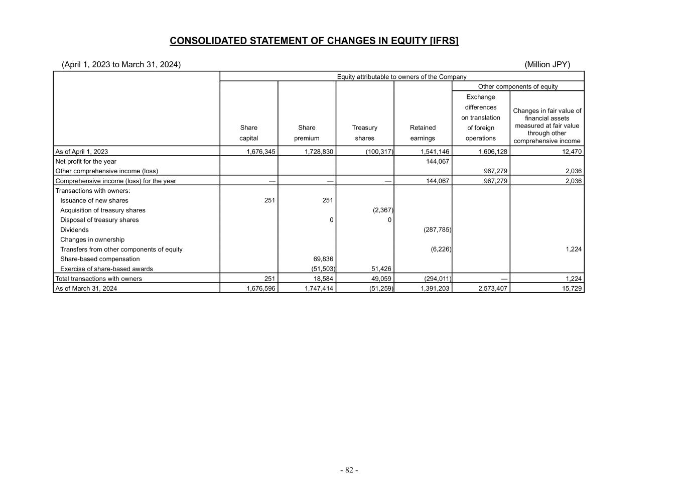 - 82 - CONSOLIDATED STATEMENT OF CHANGES IN EQUITY [IFRS] (April 1, 2023 to March 31, 2024) (Million JPY) Equity attributable to owners of the Company Share capital Share premium Treasury shares Retained earnings Other components of equity Exchange differences on translation of foreign operations Changes in fair value of financial assets measured at fair value through other comprehensive income As of April 1, 2023 1,676,345 1,728,830 (100,317) 1,541,146 1,606,128 12,470 Net profit for the year 144,067 Other comprehensive income (loss) 967,279 2,036 Comprehensive income (loss) for the year — — — 144,067 967,279 2,036 Transactions with owners: Issuance of new shares 251 251 Acquisition of treasury shares (2,367) Disposal of treasury shares 0 0 Dividends (287,785) Changes in ownership Transfers from other components of equity (6,226) 1,224 Share-based compensation 69,836 Exercise of share-based awards (51,503) 51,426 Total transactions with owners 251 18,584 49,059 (294,011) — 1,224 As of March 31, 2024 1,676,596 1,747,414 (51,259) 1,391,203 2,573,407 15,729