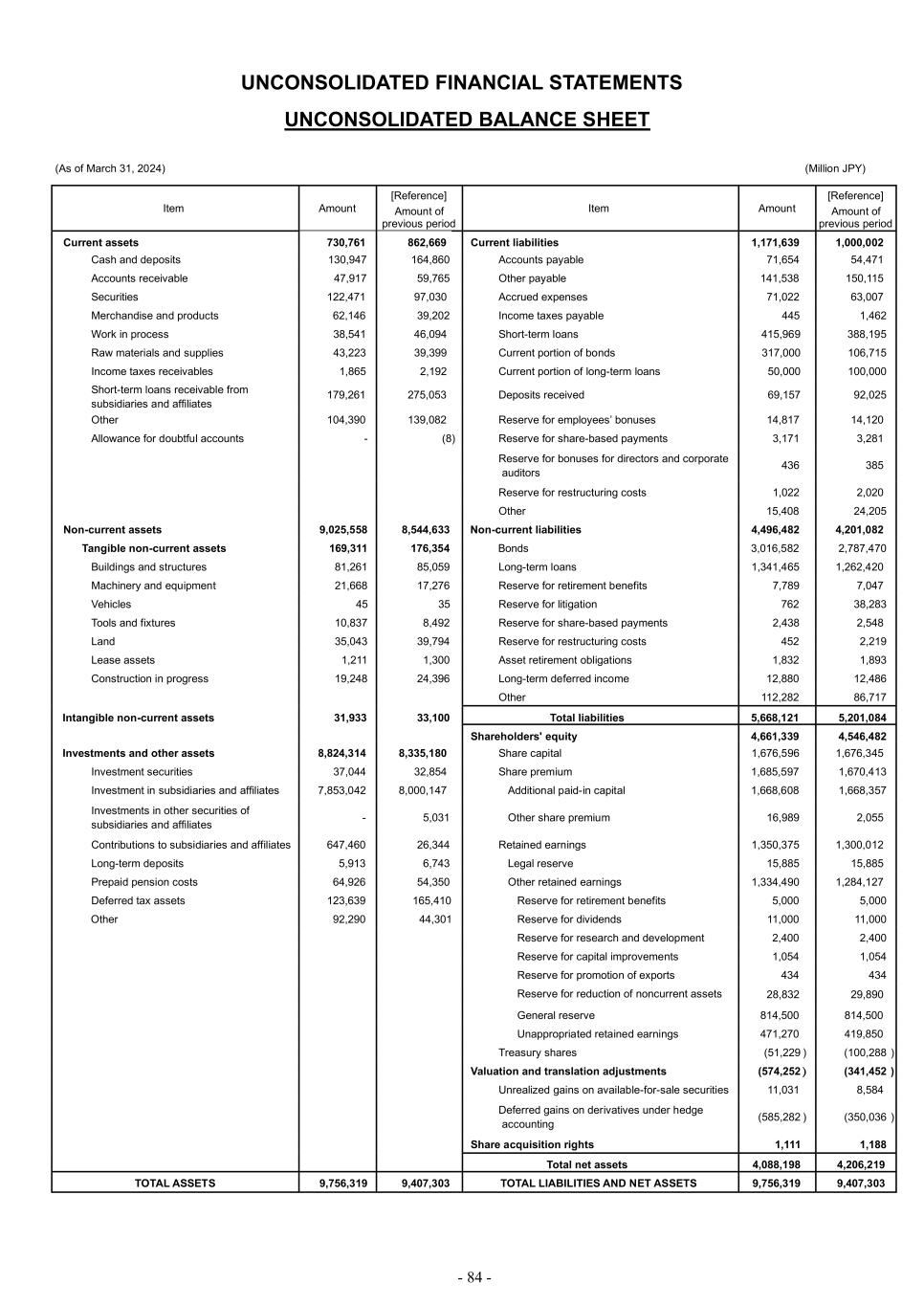 - 84 - UNCONSOLIDATED FINANCIAL STATEMENTS UNCONSOLIDATED BALANCE SHEET (As of March 31, 2024) (Million JPY) Item Amount [Reference] Amount of previous period Item Amount [Reference] Amount of previous period Current assets 730,761 862,669 Current liabilities 1,171,639 1,000,002 Cash and deposits 130,947 164,860 Accounts payable 71,654 54,471 Accounts receivable 47,917 59,765 Other payable 141,538 150,115 Securities 122,471 97,030 Accrued expenses 71,022 63,007 Merchandise and products 62,146 39,202 Income taxes payable 445 1,462 Work in process 38,541 46,094 Short-term loans 415,969 388,195 Raw materials and supplies 43,223 39,399 Current portion of bonds 317,000 106,715 Income taxes receivables 1,865 2,192 Current portion of long-term loans 50,000 100,000 Short-term loans receivable from subsidiaries and affiliates 179,261 275,053 Deposits received 69,157 92,025 Other 104,390 139,082 Reserve for employees’ bonuses 14,817 14,120 Allowance for doubtful accounts - (8 ) Reserve for share-based payments 3,171 3,281 ) Reserve for bonuses for directors and corporate auditors 436 385 Reserve for restructuring costs 1,022 2,020 Other 15,408 24,205 Non-current assets 9,025,558 8,544,633 Non-current liabilities 4,496,482 4,201,082 Tangible non-current assets 169,311 176,354 Bonds 3,016,582 2,787,470 Buildings and structures 81,261 85,059 Long-term loans 1,341,465 1,262,420 Machinery and equipment 21,668 17,276 Reserve for retirement benefits 7,789 7,047 Vehicles 45 35 Reserve for litigation 762 38,283 Tools and fixtures 10,837 8,492 Reserve for share-based payments 2,438 2,548 Land 35,043 39,794 Reserve for restructuring costs 452 2,219 Lease assets 1,211 1,300 Asset retirement obligations 1,832 1,893 Construction in progress 19,248 24,396 Long-term deferred income 12,880 12,486 Other 112,282 86,717 Intangible non-current assets 31,933 33,100 Total liabilities 5,668,121 5,201,084 Shareholders' equity 4,661,339 4,546,482 Investments and other assets 8,824,314 8,335,180 Share capital 1,676,596 1,676,345 Investment securities 37,044 32,854 Share premium 1,685,597 1,670,413 Investment in subsidiaries and affiliates 7,853,042 8,000,147 Additional paid-in capital 1,668,608 1,668,357 Investments in other securities of subsidiaries and affiliates - 5,031 Other share premium 16,989 2,055 Contributions to subsidiaries and affiliates 647,460 26,344 Retained earnings 1,350,375 1,300,012 Long-term deposits 5,913 6,743 Legal reserve 15,885 15,885 Prepaid pension costs 64,926 54,350 Other retained earnings 1,334,490 1,284,127 Deferred tax assets 123,639 165,410 Reserve for retirement benefits 5,000 5,000 Other 92,290 44,301 Reserve for dividends 11,000 11,000 Reserve for research and development 2,400 2,400 Reserve for capital improvements 1,054 1,054 Reserve for promotion of exports 434 434 Reserve for reduction of noncurrent assets 28,832 29,890 General reserve 814,500 814,500 Unappropriated retained earnings 471,270 419,850 Treasury shares (51,229 ) (100,288 ) Valuation and translation adjustments (574,252 ) (341,452 ) Unrealized gains on available-for-sale securities 11,031 8,584 Deferred gains on derivatives under hedge accounting (585,282 ) (350,036 ) Share acquisition rights 1,111 1,188 Total net assets 4,088,198 4,206,219 TOTAL ASSETS 9,756,319 9,407,303 TOTAL LIABILITIES AND NET ASSETS 9,756,319 9,407,303