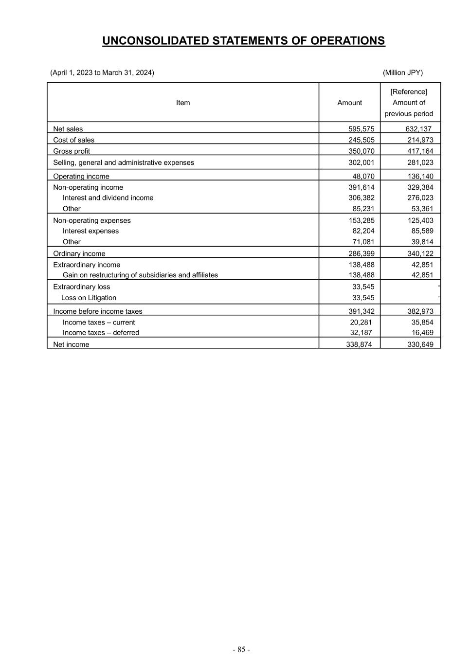 - 85 - UNCONSOLIDATED STATEMENTS OF OPERATIONS (April 1, 2023 to March 31, 2024) (Million JPY) Item Amount [Reference] Amount of previous period Net sales 595,575 632,137 Cost of sales 245,505 214,973 Gross profit 350,070 417,164 Selling, general and administrative expenses 302,001 281,023 Operating income 48,070 136,140 Non-operating income 391,614 329,384 Interest and dividend income 306,382 276,023 Other 85,231 53,361 Non-operating expenses 153,285 125,403 Interest expenses 82,204 85,589 Other 71,081 39,814 Ordinary income 286,399 340,122 Extraordinary income 138,488 42,851 Gain on restructuring of subsidiaries and affiliates 138,488 42,851 Extraordinary loss Loss on Litigation 33,545 33,545 - - Income before income taxes 391,342 382,973 Income taxes – current 20,281 35,854 Income taxes – deferred 32,187 16,469 Net income 338,874 330,649