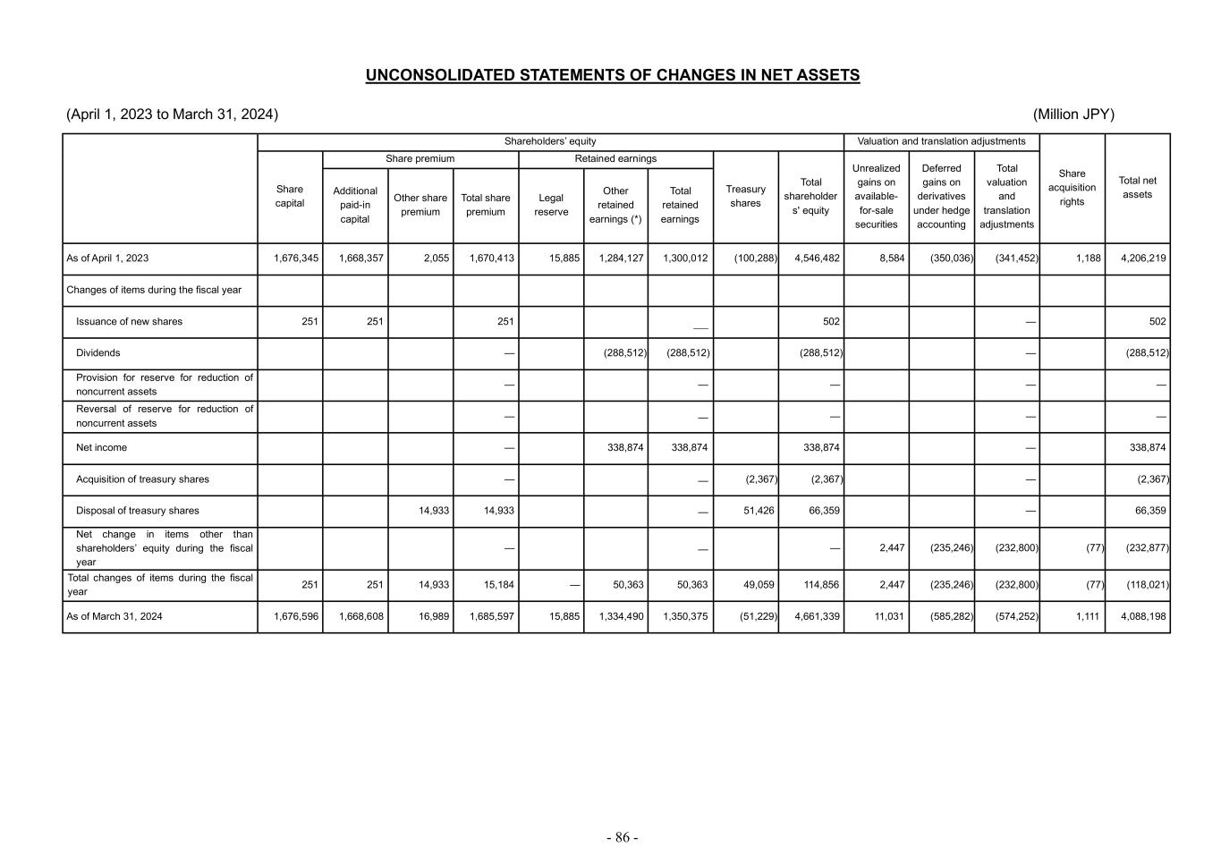- 86 - UNCONSOLIDATED STATEMENTS OF CHANGES IN NET ASSETS (April 1, 2023 to March 31, 2024) (Million JPY) Shareholders’ equity Valuation and translation adjustments Share acquisition rights Total net assets Share capital Share premium Retained earnings Treasury shares Total shareholder s' equity Unrealized gains on available- for-sale securities Deferred gains on derivatives under hedge accounting Total valuation and translation adjustments Additional paid-in capital Other share premium Total share premium Legal reserve Other retained earnings (*) Total retained earnings As of April 1, 2023 1,676,345 1,668,357 2,055 1,670,413 15,885 1,284,127 1,300,012 (100,288) 4,546,482 8,584 (350,036) (341,452) 1,188 4,206,219 Changes of items during the fiscal year Issuance of new shares 251 251 251 — 502 — 502 Dividends — (288,512) (288,512) (288,512) — (288,512) Provision for reserve for reduction of noncurrent assets — — — — — Reversal of reserve for reduction of noncurrent assets — — — — — Net income — 338,874 338,874 338,874 — 338,874 Acquisition of treasury shares — — (2,367) (2,367) — (2,367) Disposal of treasury shares 14,933 14,933 — 51,426 66,359 — 66,359 Net change in items other than shareholders’ equity during the fiscal year — — — 2,447 (235,246) (232,800) (77) (232,877) Total changes of items during the fiscal year 251 251 14,933 15,184 — 50,363 50,363 49,059 114,856 2,447 (235,246) (232,800) (77) (118,021) As of March 31, 2024 1,676,596 1,668,608 16,989 1,685,597 15,885 1,334,490 1,350,375 (51,229) 4,661,339 11,031 (585,282) (574,252) 1,111 4,088,198