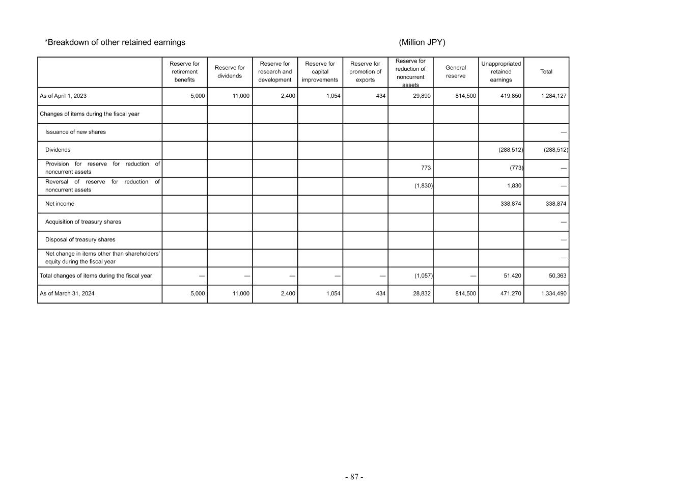 - 87 - *Breakdown of other retained earnings (Million JPY) Reserve for retirement benefits Reserve for dividends Reserve for research and development Reserve for capital improvements Reserve for promotion of exports Reserve for reduction of noncurrent assets General reserve Unappropriated retained earnings Total As of April 1, 2023 5,000 11,000 2,400 1,054 434 29,890 814,500 419,850 1,284,127 Changes of items during the fiscal year Issuance of new shares — Dividends (288,512) (288,512) Provision for reserve for reduction of noncurrent assets 773 (773) — Reversal of reserve for reduction of noncurrent assets (1,830) 1,830 — Net income 338,874 338,874 Acquisition of treasury shares — Disposal of treasury shares — Net change in items other than shareholders’ equity during the fiscal year — Total changes of items during the fiscal year — — — — — (1,057) — 51,420 50,363 As of March 31, 2024 5,000 11,000 2,400 1,054 434 28,832 814,500 471,270 1,334,490