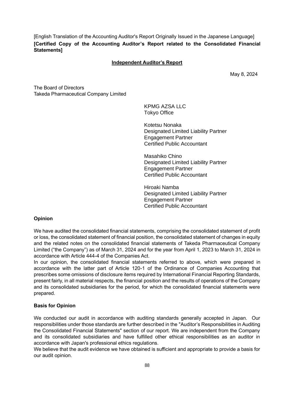 88 [English Translation of the Accounting Auditor's Report Originally Issued in the Japanese Language] [Certified Copy of the Accounting Auditor’s Report related to the Consolidated Financial Statements] Independent Auditor’s Report May 8, 2024 The Board of Directors Takeda Pharmaceutical Company Limited KPMG AZSA LLC Tokyo Office Kotetsu Nonaka Designated Limited Liability Partner Engagement Partner Certified Public Accountant Masahiko Chino Designated Limited Liability Partner Engagement Partner Certified Public Accountant Hiroaki Namba Designated Limited Liability Partner Engagement Partner Certified Public Accountant Opinion We have audited the consolidated financial statements, comprising the consolidated statement of profit or loss, the consolidated statement of financial position, the consolidated statement of changes in equity and the related notes on the consolidated financial statements of Takeda Pharmaceutical Company Limited (“the Company”) as of March 31, 2024 and for the year from April 1, 2023 to March 31, 2024 in accordance with Article 444-4 of the Companies Act. In our opinion, the consolidated financial statements referred to above, which were prepared in accordance with the latter part of Article 120-1 of the Ordinance of Companies Accounting that prescribes some omissions of disclosure items required by International Financial Reporting Standards, present fairly, in all material respects, the financial position and the results of operations of the Company and its consolidated subsidiaries for the period, for which the consolidated financial statements were prepared. Basis for Opinion We conducted our audit in accordance with auditing standards generally accepted in Japan. Our responsibilities under those standards are further described in the "Auditor’s Responsibilities in Auditing the Consolidated Financial Statements" section of our report. We are independent from the Company and its consolidated subsidiaries and have fulfilled other ethical responsibilities as an auditor in accordance with Japan's professional ethics regulations. We believe that the audit evidence we have obtained is sufficient and appropriate to provide a basis for our audit opinion.