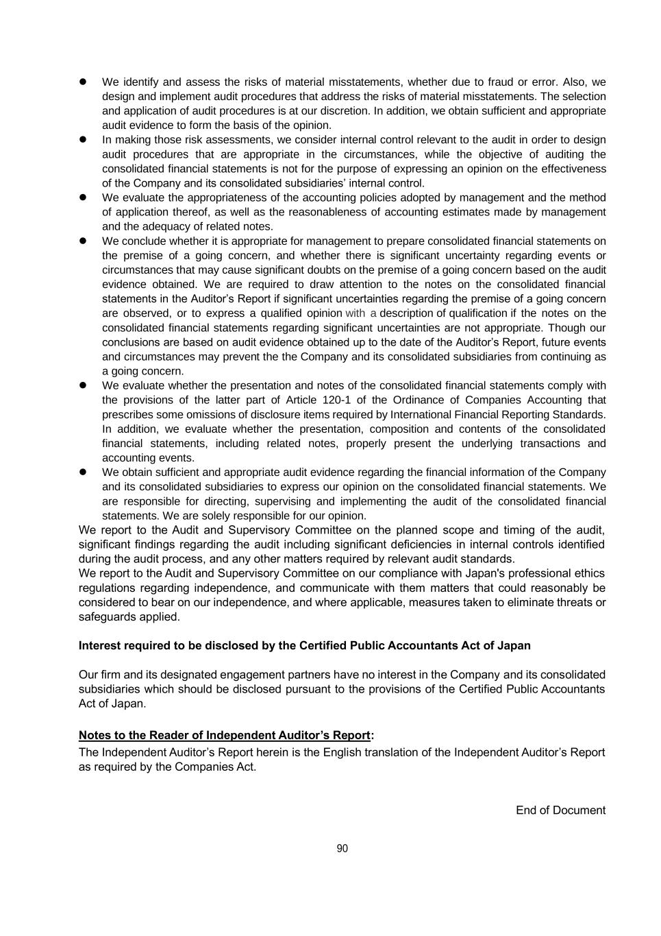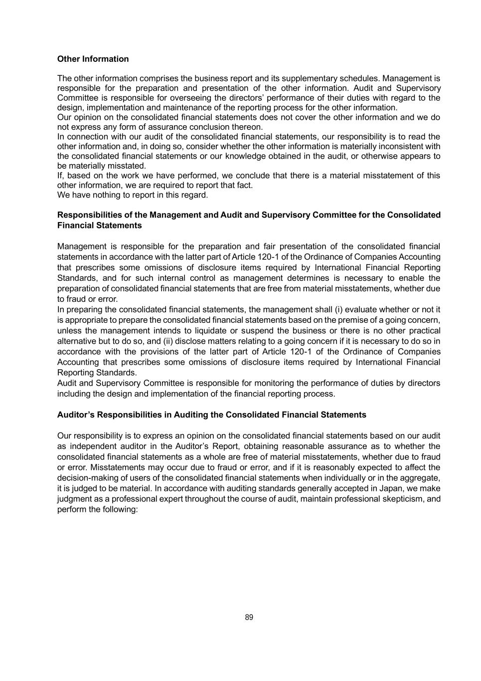 89 Other Information The other information comprises the business report and its supplementary schedules. Management is responsible for the preparation and presentation of the other information. Audit and Supervisory Committee is responsible for overseeing the directors’ performance of their duties with regard to the design, implementation and maintenance of the reporting process for the other information. Our opinion on the consolidated financial statements does not cover the other information and we do not express any form of assurance conclusion thereon. In connection with our audit of the consolidated financial statements, our responsibility is to read the other information and, in doing so, consider whether the other information is materially inconsistent with the consolidated financial statements or our knowledge obtained in the audit, or otherwise appears to be materially misstated. If, based on the work we have performed, we conclude that there is a material misstatement of this other information, we are required to report that fact. We have nothing to report in this regard. Responsibilities of the Management and Audit and Supervisory Committee for the Consolidated Financial Statements Management is responsible for the preparation and fair presentation of the consolidated financial statements in accordance with the latter part of Article 120-1 of the Ordinance of Companies Accounting that prescribes some omissions of disclosure items required by International Financial Reporting Standards, and for such internal control as management determines is necessary to enable the preparation of consolidated financial statements that are free from material misstatements, whether due to fraud or error. In preparing the consolidated financial statements, the management shall (i) evaluate whether or not it is appropriate to prepare the consolidated financial statements based on the premise of a going concern, unless the management intends to liquidate or suspend the business or there is no other practical alternative but to do so, and (ii) disclose matters relating to a going concern if it is necessary to do so in accordance with the provisions of the latter part of Article 120-1 of the Ordinance of Companies Accounting that prescribes some omissions of disclosure items required by International Financial Reporting Standards. Audit and Supervisory Committee is responsible for monitoring the performance of duties by directors including the design and implementation of the financial reporting process. Auditor’s Responsibilities in Auditing the Consolidated Financial Statements Our responsibility is to express an opinion on the consolidated financial statements based on our audit as independent auditor in the Auditor’s Report, obtaining reasonable assurance as to whether the consolidated financial statements as a whole are free of material misstatements, whether due to fraud or error. Misstatements may occur due to fraud or error, and if it is reasonably expected to affect the decision-making of users of the consolidated financial statements when individually or in the aggregate, it is judged to be material. In accordance with auditing standards generally accepted in Japan, we make judgment as a professional expert throughout the course of audit, maintain professional skepticism, and perform the following: