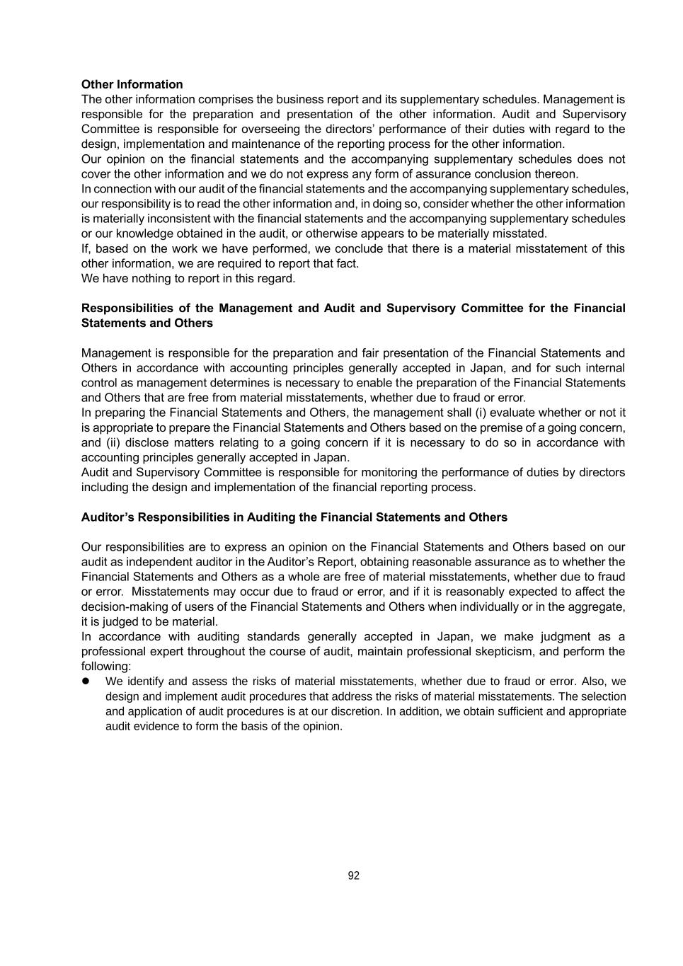 92 Other Information The other information comprises the business report and its supplementary schedules. Management is responsible for the preparation and presentation of the other information. Audit and Supervisory Committee is responsible for overseeing the directors’ performance of their duties with regard to the design, implementation and maintenance of the reporting process for the other information. Our opinion on the financial statements and the accompanying supplementary schedules does not cover the other information and we do not express any form of assurance conclusion thereon. In connection with our audit of the financial statements and the accompanying supplementary schedules, our responsibility is to read the other information and, in doing so, consider whether the other information is materially inconsistent with the financial statements and the accompanying supplementary schedules or our knowledge obtained in the audit, or otherwise appears to be materially misstated. If, based on the work we have performed, we conclude that there is a material misstatement of this other information, we are required to report that fact. We have nothing to report in this regard. Responsibilities of the Management and Audit and Supervisory Committee for the Financial Statements and Others Management is responsible for the preparation and fair presentation of the Financial Statements and Others in accordance with accounting principles generally accepted in Japan, and for such internal control as management determines is necessary to enable the preparation of the Financial Statements and Others that are free from material misstatements, whether due to fraud or error. In preparing the Financial Statements and Others, the management shall (i) evaluate whether or not it is appropriate to prepare the Financial Statements and Others based on the premise of a going concern, and (ii) disclose matters relating to a going concern if it is necessary to do so in accordance with accounting principles generally accepted in Japan. Audit and Supervisory Committee is responsible for monitoring the performance of duties by directors including the design and implementation of the financial reporting process. Auditor’s Responsibilities in Auditing the Financial Statements and Others Our responsibilities are to express an opinion on the Financial Statements and Others based on our audit as independent auditor in the Auditor’s Report, obtaining reasonable assurance as to whether the Financial Statements and Others as a whole are free of material misstatements, whether due to fraud or error. Misstatements may occur due to fraud or error, and if it is reasonably expected to affect the decision-making of users of the Financial Statements and Others when individually or in the aggregate, it is judged to be material. In accordance with auditing standards generally accepted in Japan, we make judgment as a professional expert throughout the course of audit, maintain professional skepticism, and perform the following: ⚫ We identify and assess the risks of material misstatements, whether due to fraud or error. Also, we design and implement audit procedures that address the risks of material misstatements. The selection and application of audit procedures is at our discretion. In addition, we obtain sufficient and appropriate audit evidence to form the basis of the opinion.