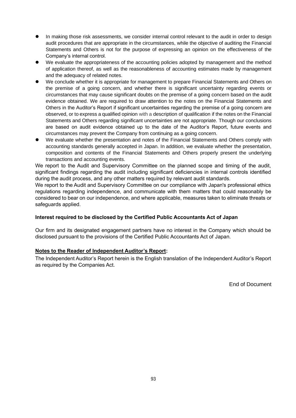 93 ⚫ In making those risk assessments, we consider internal control relevant to the audit in order to design audit procedures that are appropriate in the circumstances, while the objective of auditing the Financial Statements and Others is not for the purpose of expressing an opinion on the effectiveness of the Company’s internal control. ⚫ We evaluate the appropriateness of the accounting policies adopted by management and the method of application thereof, as well as the reasonableness of accounting estimates made by management and the adequacy of related notes. ⚫ We conclude whether it is appropriate for management to prepare Financial Statements and Others on the premise of a going concern, and whether there is significant uncertainty regarding events or circumstances that may cause significant doubts on the premise of a going concern based on the audit evidence obtained. We are required to draw attention to the notes on the Financial Statements and Others in the Auditor’s Report if significant uncertainties regarding the premise of a going concern are observed, or to express a qualified opinion with a description of qualification if the notes on the Financial Statements and Others regarding significant uncertainties are not appropriate. Though our conclusions are based on audit evidence obtained up to the date of the Auditor’s Report, future events and circumstances may prevent the Company from continuing as a going concern. ⚫ We evaluate whether the presentation and notes of the Financial Statements and Others comply with accounting standards generally accepted in Japan. In addition, we evaluate whether the presentation, composition and contents of the Financial Statements and Others properly present the underlying transactions and accounting events. We report to the Audit and Supervisory Committee on the planned scope and timing of the audit, significant findings regarding the audit including significant deficiencies in internal controls identified during the audit process, and any other matters required by relevant audit standards. We report to the Audit and Supervisory Committee on our compliance with Japan's professional ethics regulations regarding independence, and communicate with them matters that could reasonably be considered to bear on our independence, and where applicable, measures taken to eliminate threats or safeguards applied. Interest required to be disclosed by the Certified Public Accountants Act of Japan Our firm and its designated engagement partners have no interest in the Company which should be disclosed pursuant to the provisions of the Certified Public Accountants Act of Japan. Notes to the Reader of Independent Auditor’s Report: The Independent Auditor’s Report herein is the English translation of the Independent Auditor’s Report as required by the Companies Act. End of Document