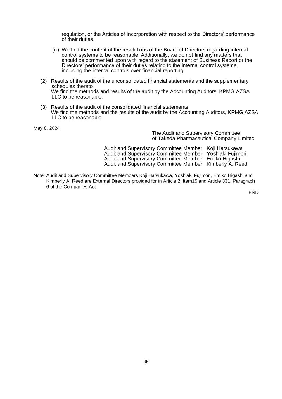 95 regulation, or the Articles of Incorporation with respect to the Directors’ performance of their duties. (iii) We find the content of the resolutions of the Board of Directors regarding internal control systems to be reasonable. Additionally, we do not find any matters that should be commented upon with regard to the statement of Business Report or the Directors’ performance of their duties relating to the internal control systems, including the internal controls over financial reporting. (2) Results of the audit of the unconsolidated financial statements and the supplementary schedules thereto We find the methods and results of the audit by the Accounting Auditors, KPMG AZSA LLC to be reasonable. (3) Results of the audit of the consolidated financial statements We find the methods and the results of the audit by the Accounting Auditors, KPMG AZSA LLC to be reasonable. May 8, 2024 The Audit and Supervisory Committee of Takeda Pharmaceutical Company Limited Audit and Supervisory Committee Member: Koji Hatsukawa Audit and Supervisory Committee Member: Yoshiaki Fujimori Audit and Supervisory Committee Member: Emiko Higashi Audit and Supervisory Committee Member: Kimberly A. Reed Note: Audit and Supervisory Committee Members Koji Hatsukawa, Yoshiaki Fujimori, Emiko Higashi and Kimberly A. Reed are External Directors provided for in Article 2, Item15 and Article 331, Paragraph 6 of the Companies Act. END
