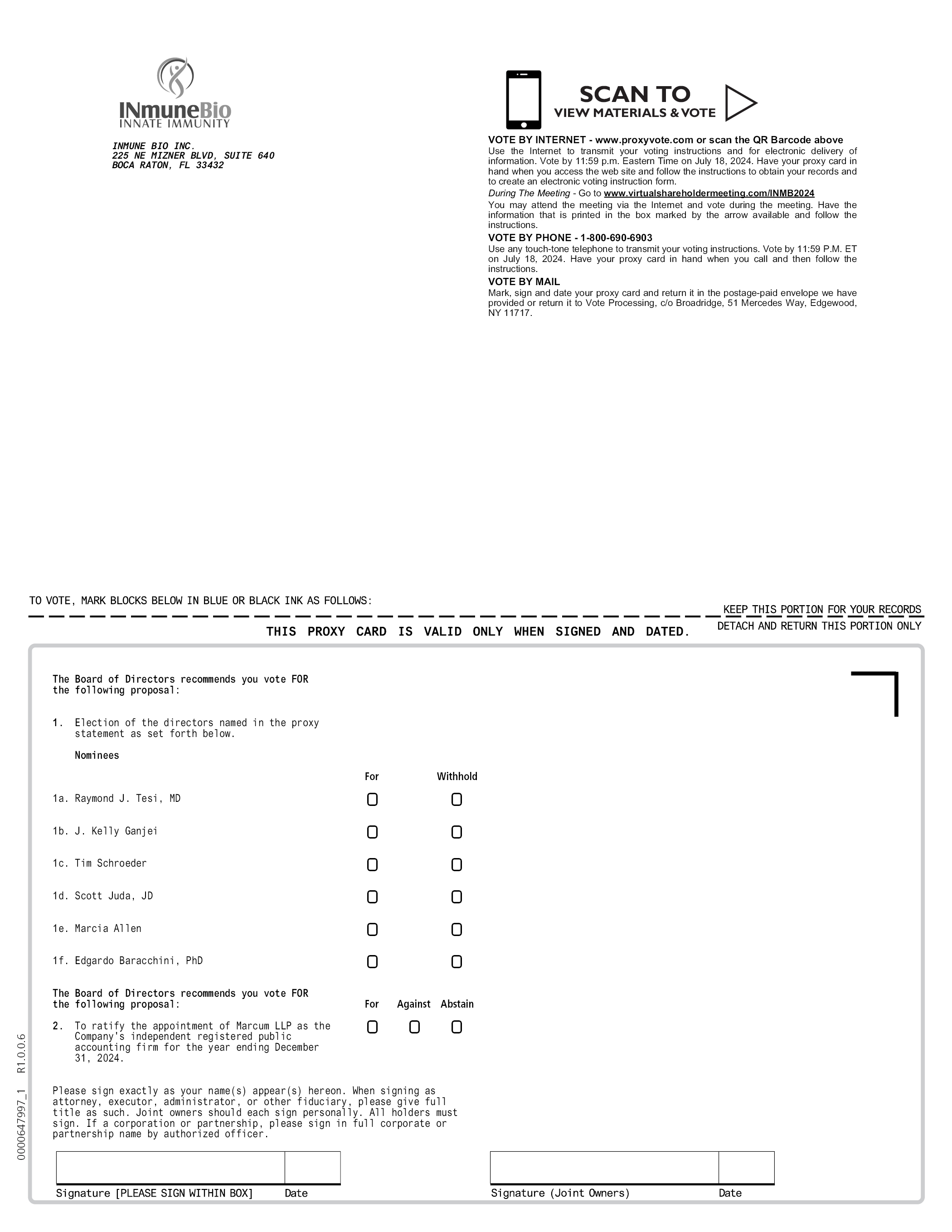 INMUNE BIO INC. 225 NE MIZNER BLVD, SUITE 640 BOCA RATON, FL 33432 SCAN TO VIEW MATERIALS & VOTE VOTE BY INTERNET - www.proxyvote.com or scan the QR Barcode above Use the Internet to transmit your voting instructions and for electronic delivery of information. Vote by 11:59 p.m. Eastern Time on July 18, 2024. Have your proxy card in hand when you access the web site and follow the instructions to obtain your records and to create an electronic voting instruction form. During The Meeting - Go to www.virtualshareholdermeeting.com/INMB2024 You may attend the meeting via the Internet and vote during the meeting. Have the information that is printed in the box marked by the arrow available and follow the instructions. VOTE BY PHONE - 1-800-690-6903 Use any touch-tone telephone to transmit your voting instructions. Vote by 11:59 P.M. ET on July 18, 2024. Have your proxy card in hand when you call and then follow the instructions. VOTE BY MAIL Mark, sign and date your proxy card and return it in the postage-paid envelope we have provided or return it to Vote Processing, c/o Broadridge, 51 Mercedes Way, Edgewood, NY 11717. TO VOTE, MARK BLOCKS BELOW IN BLUE OR BLACK INK AS FOLLOWS: KEEP THIS PORTION FOR YOUR RECORDS THIS PROXY CARD IS VALID ONLY WHEN SIGNED AND DATED. DETACH AND RETURN THIS PORTION ONLY The Board of Directors recommends you vote FOR the following proposal: 1. Election of the directors named in the proxy statement as set forth below. Nominees 1a. Raymond J. Tesi, MD 1b. J. Kelly Ganjei 1c. Tim Schroeder 1d. Scott Juda, JD 1e. Marcia Allen 1f. Edgardo Baracchini, PhD The Board of Directors recommends you vote FOR the following proposal: 2. To ratify the appointment of Marcum LLP as the Company’s independent registered public accounting firm for the year ending December 31, 2024. Please sign exactly as your name(s) appear(s) hereon. When signing as attorney, executor, administrator, or other fiduciary, please give full title as such. Joint owners should each sign personally. All holders must sign. If a corporation or partnership, please sign in full corporate or partnership name by authorized officer. Signature [PLEASE SIGN WITHIN BOX] For Withhold Against Abstain 0000647997_1 R1.0.0.6 Signature (Joint Owners) Date