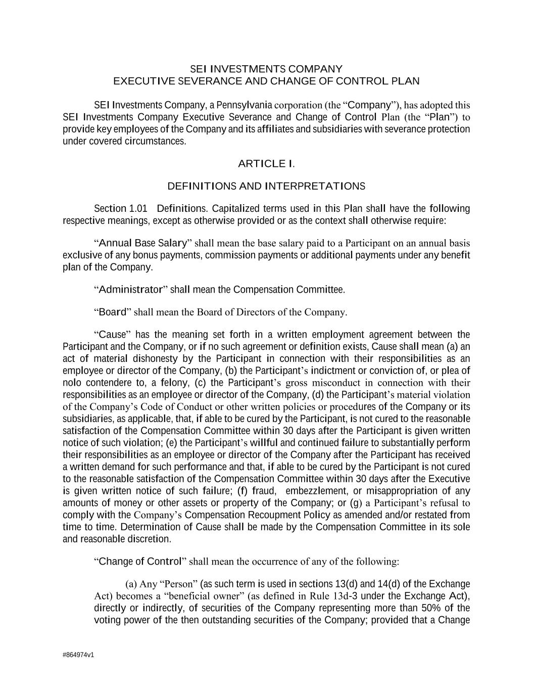 DB1/ 144570925.9 2 #852344v7 (c) “Change of Control” shall be deemed to have occurred if: (i) any “person” (as such term is used in sections 13(d) and 14(d) of the Exchange Act) becomes a “beneficial owner” (as defined in Rule 13d-3 under the Exchange Act), directly or indirectly, of securities of the Company representing more than 50% of the voting power of the then outstanding securities of the Company; provided that a Change of Control shall not be deemed to occur as a result of a transaction in which the Company becomes a subsidiary of another corporation and in which the shareholders of the Company, immediately prior to the transaction, will beneficially own, immediately after the transaction, shares entitling such shareholders to more than 50% of all votes to which all shareholders of the parent corporation would be entitled in the election of directors; (ii) the consummation of (1) a merger or consolidation of the Company with another corporation where the shareholders of the Company, immediately prior to the merger or consolidation, will not beneficially own, immediately after the merger or consolidation, shares entitling such shareholders to more than 50% of all votes to which all shareholders of the surviving corporation would be entitled in the election of directors, (2) a sale or other disposition of all or substantially all of the assets of the Company, or (3) a liquidation or dissolution of the Company; or (iii) after the Effective Date, directors are elected such that a majority of the members of the Board shall have been members of the Board for less than one year, unless the election or nomination for election of each new director who was not a director at the beginning of such one-year period was approved by a vote of at least two-thirds of the directors then still in office who were directors at the beginning of such period. Notwithstanding the foregoing, for any Grants subject to the requirements of section 409A of the Code that will become payable on a Change of Control, the transaction constituting a “Change of Control” must also constitute a “change in control event” for purposes of section 409A(a)(2)(A)(v) of the Code. (d) “Code” means the Internal Revenue Code of 1986, as amended, and the regulations promulgated thereunder. (e) “Committee” means the Compensation Committee of the Board. The Committee shall be comprised of not less than such number of Directors as shall be required to permit Grants granted under the Plan to qualify under Rule 16b-3 of the Exchange Act, and each member of the Committee shall be a “Non-Employee Director” within the meaning of Rule 16b- 3 of the Exchange Act. (f) “Company” means SEI Investments Company and any successor corporation. (g) “Company Stock” means the common stock of the Company, par value $0.01 per share. (h) “Consultants” means any consultant or advisor who performs bona fide services for the Employer; provided that the consultant or advisor renders bona fide services to the