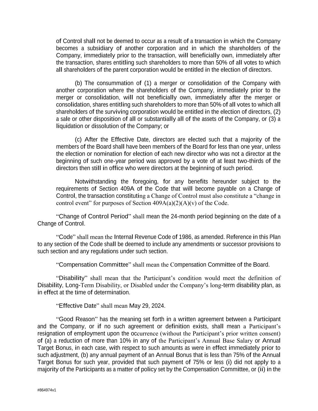DB1/ 144570925.9 4 #852344v7 (r) “Good Reason” has the meaning set forth in a written employment, severance or other agreement or plan between the Participant and the Employer or, if there is no such agreement or plan or no such definition, means, the occurrence of one or more of the following, without Participant’s consent: (i) a material diminution of the Participant’s authority, duties or responsibilities; or (ii) a material diminution in the Participant’s base compensation or annual bonus opportunity of more than 10% (other than an across the board reduction to similarly situated employees). The Participant must provide written notice of termination for Good Reason to the Employer that employs the Participant within 30 days after the event constituting Good Reason. The Employer shall have a period of 30 days in which it may correct the act or failure to act that constitutes the grounds for Good Reason as set forth in the Participant’s notice of termination. If the Employer does not correct the act or failure to act, the Participant must terminate his or her employment for Good Reason within 30 days after the end of the cure period, in order for the termination to be considered a Good Reason termination. (s) “Grant” means an Option, Stock Unit, Stock Award, SAR, Dividend Equivalent, or Other Stock-Based Award granted under the Plan. (t) “Grant Agreement” means the written instrument that sets forth the terms and conditions of a Grant, including all amendments thereto. (u) “Incentive Stock Option” means an Option that is intended to meet the requirements of an incentive stock option under section 422 of the Code. (v) “Non-Employee Director” means a member of the Board who is not an Employee. (w) “Nonqualified Stock Option” means an Option that is not intended to meet the requirements of section 422 of the Code. (x) “Option” means an Incentive Stock Option or Nonqualified Stock Option, as described in Section 7. (y) “Other Stock-Based Award” means any Grant based on, measured by or payable in Company Stock (other than an Option, Stock Unit, Stock Award or SAR), as described in Section 11. (z) “Participant” means an Employee, Non-Employee Director or Consultant designated by the Committee to receive a Grant under the Plan. (aa) “Prior Plan Expiration Date” means May 20, 2024, the day on which the 2014 Plan expires. (bb) “SAR” means an award of a stock appreciation right, as described in Section 10. (cc) “Stock Award” means an award of Company Stock as described in Section 9. (dd) “Stock Unit” means an award of a contractual right to receive one or more shares of Company Stock, cash or combination thereof, as described in Section 8, and denominated in a number of shares of Company Stock specified in a Grant Agreement.
