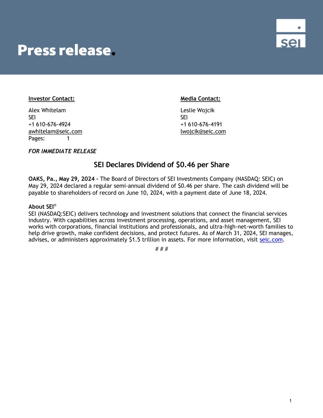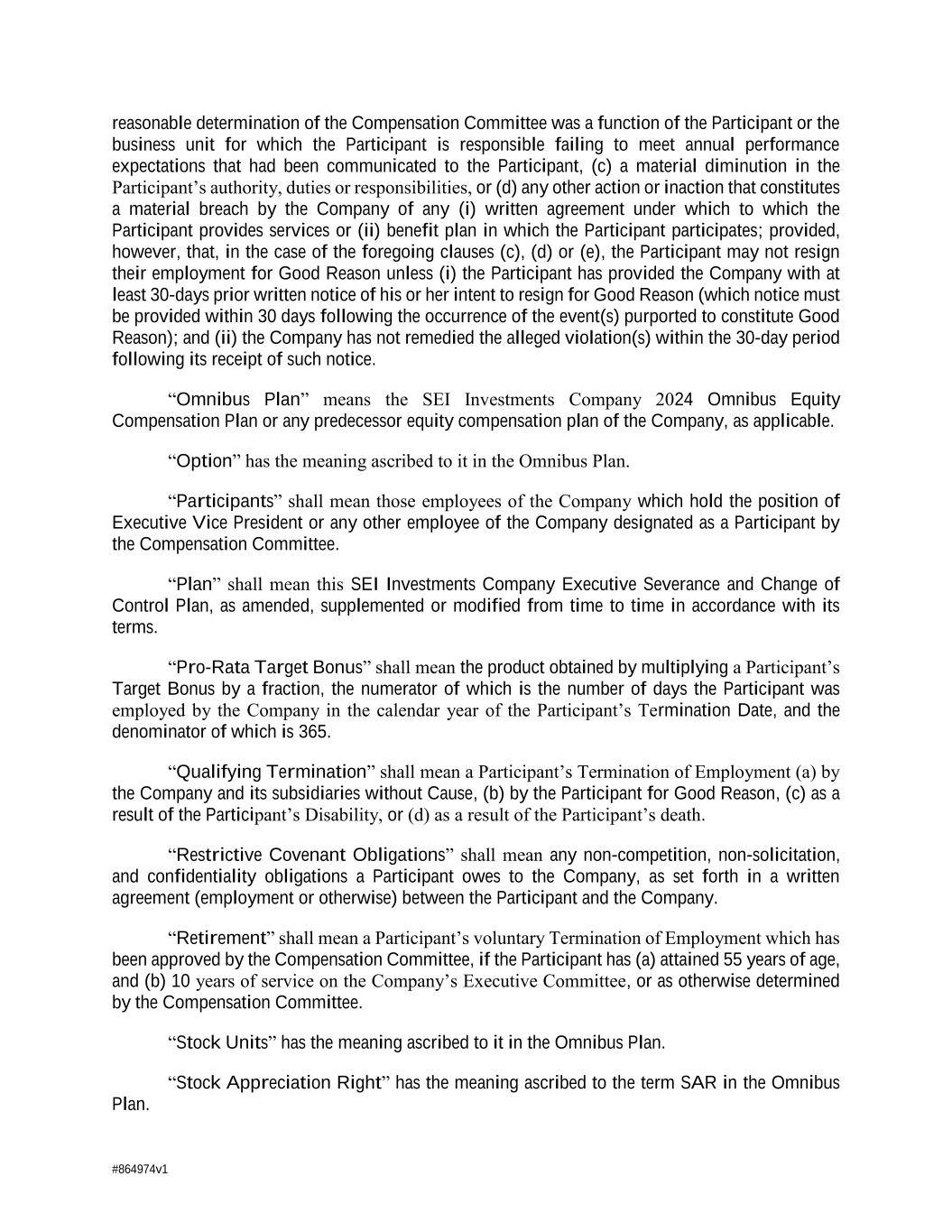 #852344v7 DB1/ 144570925.9 SEI INVESTMENTS COMPANY 2024 OMNIBUS EQUITY COMPENSATION PLAN 1. Purpose Effective as of the Effective Date, the SEI Investments Company 2024 Omnibus Equity Compensation Plan (the “Plan”) is hereby established as a successor to the SEI Investments Company 2014 Omnibus Equity Compensation Plan (the “2014 Plan”). No additional grants shall be made after the Effective Date under the 2014 Plan. Shares of Company Stock authorized under the 2014 Plan but not subject to awards that have been granted prior to or as of the Effective Date shall be available for issuance or transfer under this Plan. Outstanding grants under the 2014 Plan shall continue in effect according to their terms as in effect before the Effective Date (subject to such amendments as the Committee determines, consistent with the 2014 Plan, as applicable), and the shares with respect to outstanding grants under the 2014 Plan shall not be issued or transferred under this Plan. The purpose of the Plan is to provide designated (i) Employees of the Company and its subsidiaries, (ii) Non-Employee Directors and (iii) Consultants who perform services for the Company and its subsidiaries with the opportunity to receive grants of Options, Stock Units, Stock Awards, SARs and Other Stock-Based Awards. The Company believes that the Plan will encourage the Participants to contribute materially to the growth of the Company, thereby benefiting the Company’s shareholders, and will align the economic interests of the Participants with those of the shareholders. All capitalized terms shall be as defined in Section 2 below. 2. Definitions Whenever used in this Plan, the following terms will have the respective meanings set forth below: (a) “Board” means the Company’s Board of Directors. (b) “Cause” has the meaning set forth in a written employment, severance or other agreement or plan between the Participant and the Employer or, if there is no such agreement or plan or no such definition, Cause means (i) an act of material dishonesty by the Participant in connection with the Participant’s responsibilities as an Employee, Non-Employee Director, or Consultant, (ii) the Participant’s conviction of, or plea of nolo contendere to, a felony, (iii) the Participant’s gross misconduct in connection with the Participant’s responsibilities as an Employee, Non-Employee Director, or Consultant, (iv) fraud, embezzlement, or misappropriation of any amounts of money or assets or property of the Company, (v) the Participant’s violation of the written policies or procedures of the Company or a subsidiary, as applicable; or (vi) the Participant’s continued failure to perform his or her responsibilities as an Employee, Non-Employee Director, or Consultant after the Participant has received a written demand for such performance.